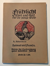 4. Bändchen: Heimat und Fremde. Hrsg. von Heinrich Moser. 17. - 21. Tsd.. Zch.: Verein für Verbreitung guter Schriften, [um 1920]. 64 S., mit zahlreichen farbigen und teilweise ganzseitigen Illustrationen in Jugendstil nach Zeichnungen von Theodor Barth, Eduard Stiefel und Gertrud Pfeiffer-Kohrt. Einband: Or.kt. Format: 8°. Reihe: Frühlicht. Wort und Bild für die junge Welt, 4.