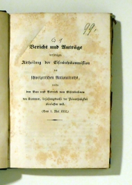Beigebunden: Bericht der Mehrheit der nationalräthlichen Eisenbahnkommission. [Bern]: [s. n.], [1852]. 101, [4], 206 S., Einband: Or.Hlwd. Format: 8°. Im "Bericht der Mehrheit der nationalräthlichen Eisenbahnkommission" wurden zwei Bogen in der Reihenfolge falsch eingebunden, nach der Seite 112 kommen die Seiten 117-124 und erst dann die Seiten 113-116. Das Beilagenverzeichnis des Mehrheitsberichts zählt 12 meist mehrfach gefaltete Beilagen mit umfangreichen ökonomischen und finanziellen Berechnungen, den Gesetzesentwürfen sowie ein grosses [127x46 cm, (bxh)] mehrfach gefaltetes Blatt, auf dem das Längenprofil der Linie Frauenfeld - St. Gallen - Rorschach dem der K.K. Österreichischen Staatseisenbahn von Mürzzuschlag nach Gloggnitz über den Semmering sowie dem der Württenbergischen Staatseisenbahn von Göppingen bis Ulm über die Raue Alp und dem der Bayerischen Staatseisenbahn von Neuenmarkt bis Hof über das Fichtelgebirge gegenübergestellt wird. Nicht aufgeführt im Verzeichnis ist eine weitere Beilage [71x39 cm, (bxh)] auf der die Längenprofile der Strecken Murten - Bern, Wynigen - Solothurn und Bern - Burgdorf miteinander verglichen werden.