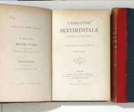Histoire d'un Jeune Homme. Paris: Michel Lévy Frères, A la Librairie Nouvelle, 1870. 2 vol, 427 p.331 p., Einband: demi-chagrin rouge à coins, à 5 nerfs. Format: 8°. Erstausgabe. Vicaire III, 726/27. - Sans mention d'édition. Aus der Bibliothek des deutschen Schriftstellers Johannes Trojan (1837-1915), in beiden Bänden mit seinem Namenszug und Jahr (1870 - Jahr des Erscheinens) auf dem fliegenden Vorsatz. Im zweiten Band anschliessend an die letzte Seite buchbinderisch sorgfältig eingebunden eine in drei Folgen erschienene Besprechung des Buches in der "Allgemeinen Zeitung" (Frankfurt), beginnend am Freitag, 18. März 1870. Der Rezensent, Namen ist nicht angegeben, wünscht sich keine solchen Bücher von deutschen Dichtern, billigt Flaubert aber "eigenthümlichen Werth und peinlichen Reiz" zu. Halblederband mit rotem Rücken und Ecken; 5 goldgeprägte Rückenfelder, umlaufender Schnitt und schwere Vorsatzblätter mit Kammmarmor