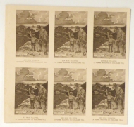 o.O.: o.V., um 1915. 1 Bl., Einband: Einblatt. Format: 29,5 x 28,5 cm (bxh). Erstausgabe. In einer Berglandschaft mit steinbedecktem Bauernhaus und See im Hintergrund zeigt der Knabe des Tell auf ein Flugzeug. Einseitig bedruckter lithographierter Bogen in Sepia mit 6 Postkarten anlässlich der Grenzbesetzung 1914/15