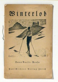 Verse für Skiläufer und Schneefreunde, (entnommen einem Manuskript und den Versen "Schnee"). Zürich: Paul Altheer, 1924. 15, [5] S., mit einer Holzstich-Illustration auf der Umschlagseite. Einband: Original-Broschur, fadengeheftet. Format: 8°. Erstausgabe. Auf der Titelseite mit eigenhändigem Namenszug von Hans Roelli, zudem beigelegt ein 31zeiliger handschriftlicher Entwurf in Bleistift für ein dreistrophiges Gedicht, das mit "Das Leben ist von einer grossen Güte" beginnt. Das Heft enthält Werbung, unter anderem Waldorf-Astoria, Globus, Forster & Co, Arosa, Arosa Kulm und dem Fotografen C[arl Franz Julius] Brandt. In der Anzeige des letzteren ist ein Foto mit der Legende "Hans Roelli im Quersprung" abgebildet, gedruckt in Fraktur