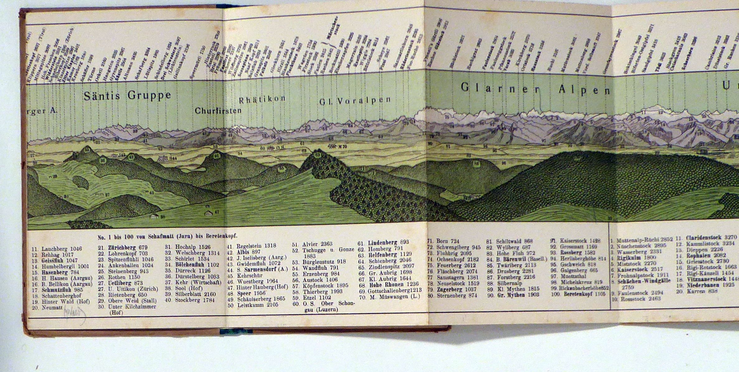 1207 m. ü. M. auf Alpen und Jura nach der Natur gezeichnet. Nebst Erklärung der Nordaussicht und Wegweiser nach dem Passwang. Basel: Lierow & Sohn, 1906. 16,5 x 160 cm, 12 S. Text, Chromolithogr. Panorama. Einband: Or.Hln. Format: kl.8°.