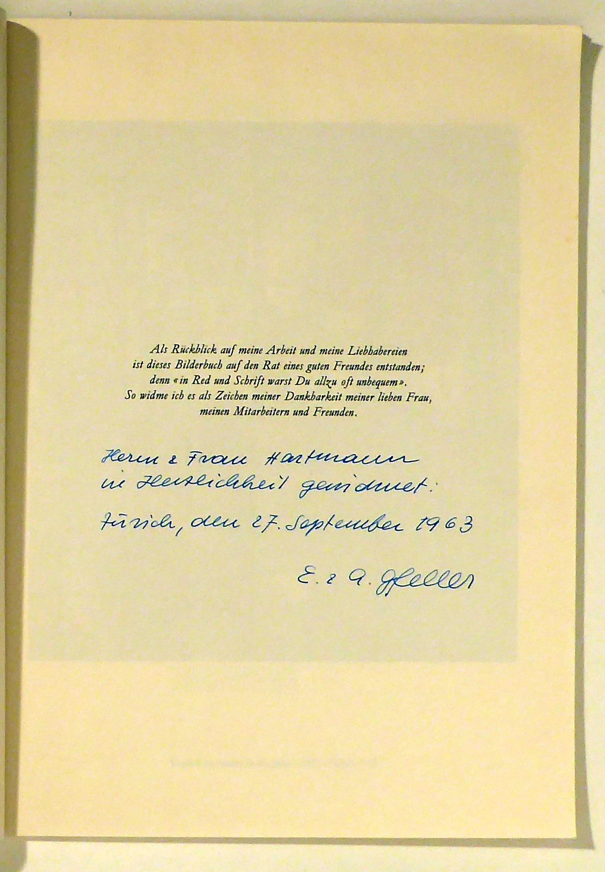 Rückblick auf meine Arbeit und meine Liebhabereien. Bilderbuch. Basel: Selbstverlag, [1962]. [68] S, 28 Tafeln mit zahlreichen Abbildungen und 4 Farbtafeln. Einband: Or.kt. Format: 4°. Text anstelle des Titelblattes: "Als Rückblick auf meine Arbeit und meine Liebhabereien ist dieses Bilderbuch auf den Rat eines guten Freundes entstanden; denn 'in Red und Schrift warst Du allzu oft unbequem'. So widme ich es als Zeichen meiner Danbarkeit meiner lieben Frau, meinen Mitarbeitern und Freunden." Auf dem Einbanddeckel das Signet "A. Gf." Mit eigenhändiger Widmung: "Herrn & Frau Hartmann in Herzlichkeit gewidmet: Zürich, den 27. September 1963 E. & A. Gfeller"