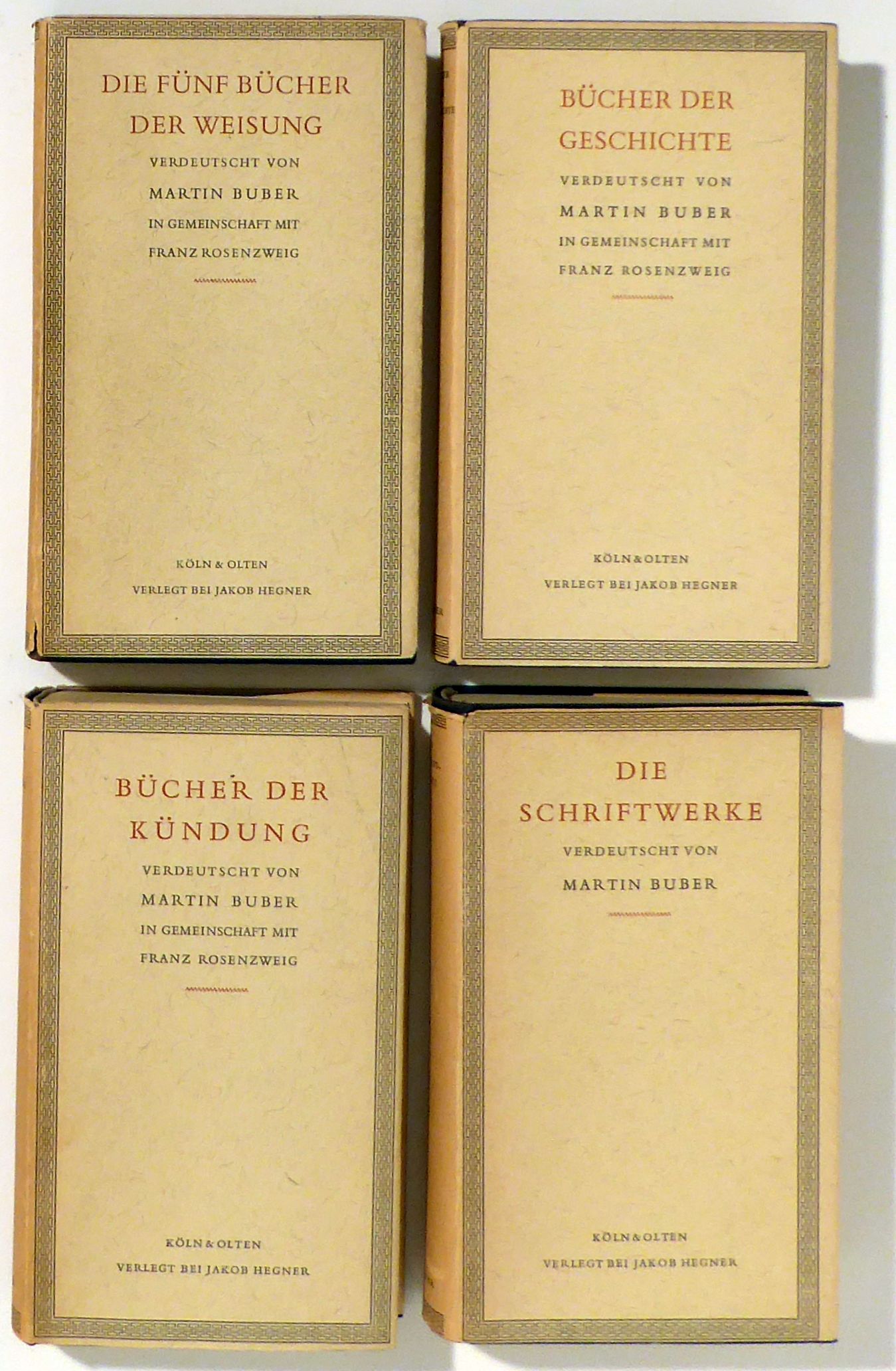 Verdeutscht von Martin Buber gemeinsam mit Franz Rosenzweig. Olten: Jakob Hegner, 1954-1962. 4 Bde., 580, 517, 778, 699 S.; Dünndruck, Einband: Or.Ln. mit Schutzumschlag. Format: kl.8°. Die hebräische Bibel nicht bloss im Wortlaut sonern auch nach ihren "erkennbaren Ausdrucksabsichten" in vier Bänden: Die Fünf Bücher der Weisung, Bücher der Geschichte, Bücher der Kündung und Die Schriftwerke. Beigelegt zwei Hefte mit Erläuterungen: Zur neuebn Verdeutschung der Schrift - Einführung in "Die fünf Bücher der Weisung" (44 S.) und Beilage zu "Die Schriftwerke" (26 S.)