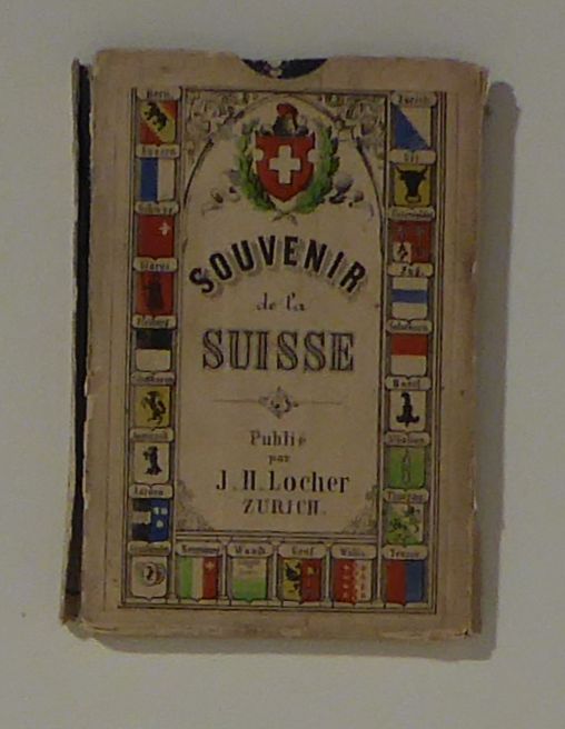 Zürich: J. H. Locher, o.J. ca, 1880. Leporello; Gesamtlänge 139 cm, Getönte Lithographie mit 23 Trachtendarstellungen (Frauentrachten, Porträts). Einband: Leinwand der Zeit in illustriertem Schuber. Format: 10 x 7 cm. Schlichter grüner Ln.-Einband d.Zt. in violettem Schuber mit farbig lithographiertem Deckelbild, dieses mit den 23 Kantonswappen und dem Schweizerwappen