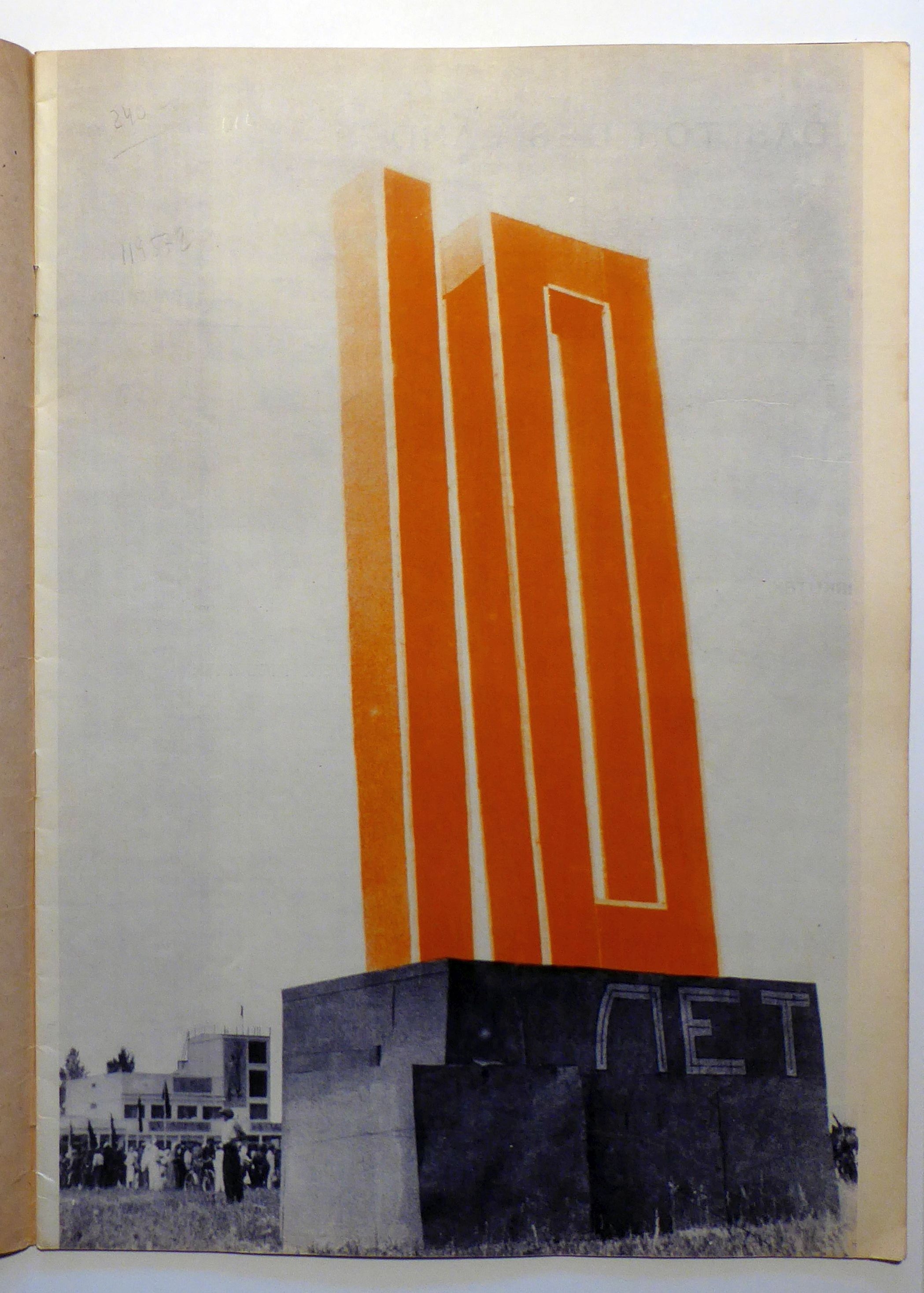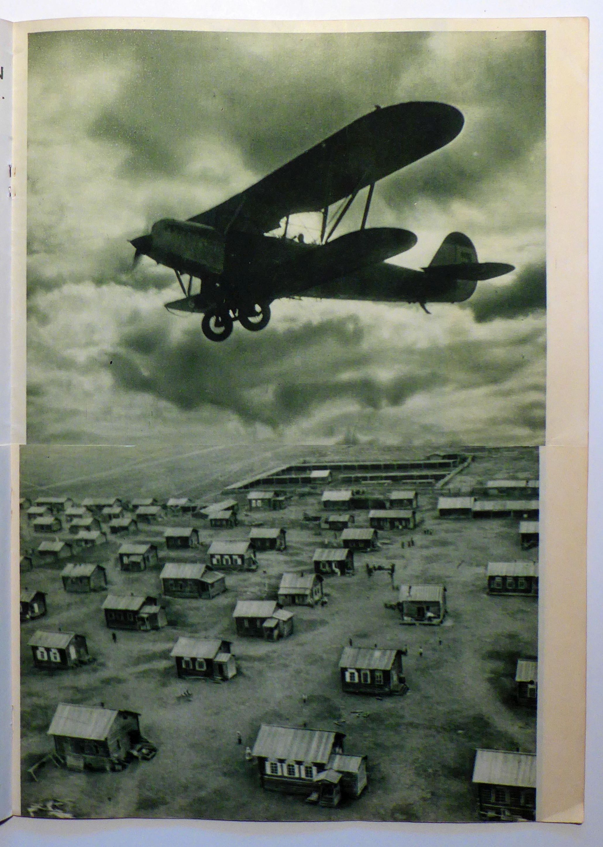 Das Heft ist dem zehnjährigen Jubiläum Burjat-Mongoliens gewidmet. Montage von I. Urasow. Übersetzung von A. Grossmann, Die mittleren 4 Blätter nur halb hoch, sie zeigen sozursagen die Sicht aus den Flugzeugen, die oben auf den Seiten vorher und nachher abgebildet sind. Die Monatsschrift «USSR im Bau» erschien in vier Sprachen (deutsch, französisch, englisch, spanisch) von 1930 bis 1941 und noch einmal 1949, in vier Sprachen (deutsch, französisch, englisch, spanisch). Zum Redaktionskollegium der von Maxim Gorkij gegründeten Zeitschrift gehörten unter anderen Georgij Pjatakov und Michail Kol’cov, einzelne Nummern erschienen unter der Leitung von Aleksandr Rodčenko oder El’ Lisickij. Viele Nummern wurden von Nikolaj Stepanovič Trošin gestaltet. Hauptsächliches Gestaltungsmerkmal war die Fotomontage, mit Beiträgen von Fotografen wie Maks Al’pert, einem der Begründer der Fotoreportage, Arkadij Šajchet und anderen. Jedes Heft war einem bestimmten Thema gewidmet
