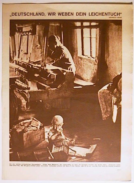Mit einer dreiseitigen Reportage: "Deutschland, wir weben dein Leichentuch" über die letzten schlesischen Hausweber. Bln.: Neuer Deutscher Verlag, 1931. S. 610 - 627, mit zahlreichen Abbildungen nach Fotografien. Einband: Illustrierter Original-Umschlag. Format: 28 x 38 cm. Reihe: A-I-Z (Arbeiter-Illustrierte-Zeitung).