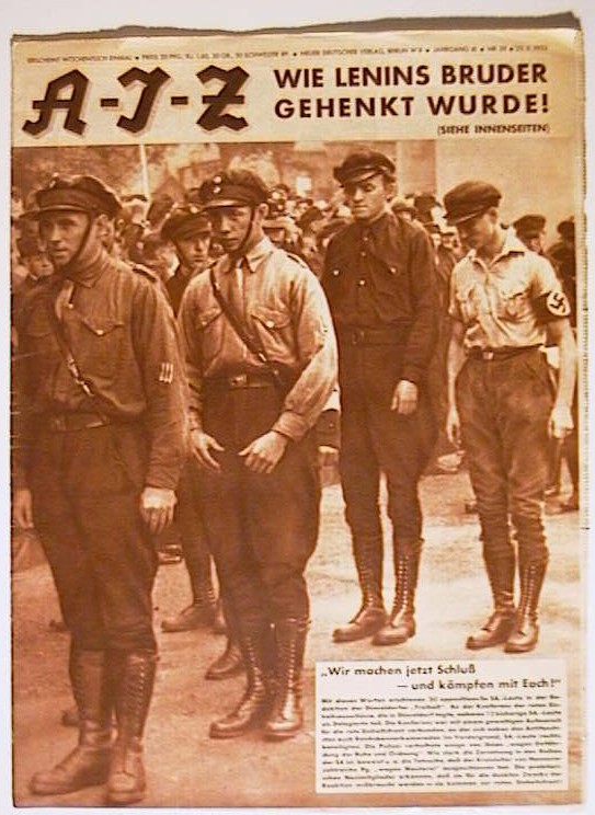 "Wie Lenins Bruder gehenkt wurde". Mit der Fotomontage von John Heartfield: "Je höher der Brotkorb- desto strammer der Maulkorb". Zudem die zweiseitige Titelgeschichte von Kurt Kersten: " Die Verschwörung und das Ende von Lenins Bruder". Die Fotomont. Bln.: Neuer Deutscher Verlag, 1932. S. 915 - 935, mit zahlreichen Abbildungen nach Fotografien. Einband: Illustrierter Original-Umschlag. Format: 28 x 38 cm. Reihe: A-I-Z (Arbeiter-Illustrierte-Zeitung).