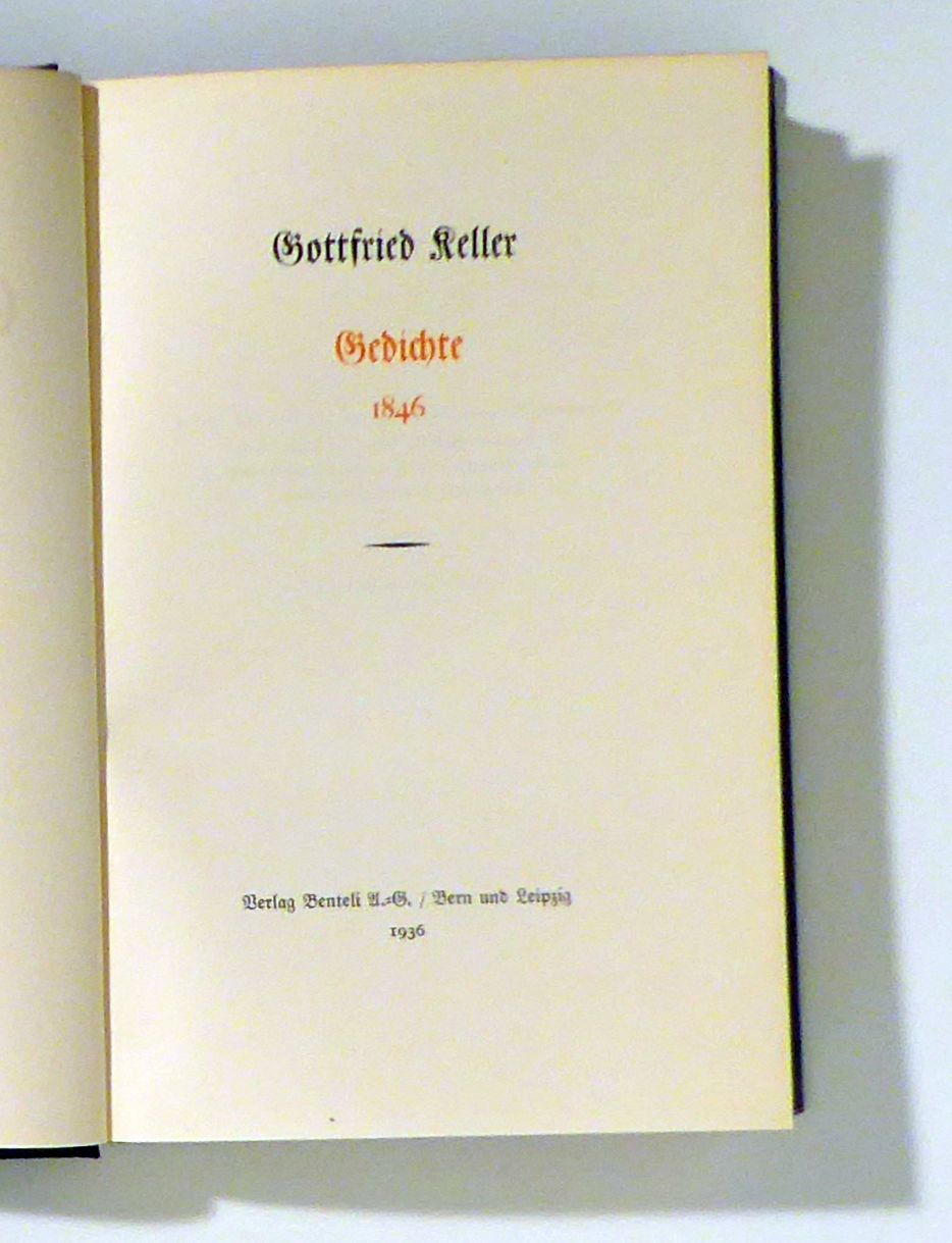 (Nachgelassene Gedichte II). Bern; Lpz.: Benteli, 1936. 437, [2] S., mit einer Titelvignette nach der Keller-Medaille von Arnold Böcklin in Holzschnitt sowie einer gefalteten Tafel mit dem Jesuiten-Gedicht und der Illustration von Emanuel Scherb aus "Freie Schweiz". Einband: Blauer Or.Ln. mit Rückenvergoldung. Format: 8°. Reihe: Sämtliche Werke, auf Grund des Nachlasses herausgegeben von Jonas Fränkel. Band 14.