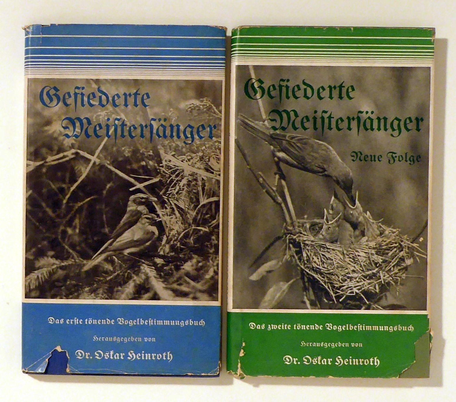 Hrsg. mit Unterstützung des Reichsbundes für Vogelschutz e.V.. Bln.-Lichterfelde: Hugo Bermühler Verlag, [1935]. 2 Bde., 96; 87, [1] S., mit zusammen 36 mehrfarbigen und 48 s/w Tafeln mit über 200 Abbildungen. Einband: Original-Leinwand, mit Schutzumschlag. Format: gr.8°. Erstausgabe. Die beiden Begleitbücher zu dem von der Kulturabteilung der Carl Lindström A.G., Berlin in Zusammenarbeit mit Helmuck Sick und Joachim Steinbacher produzierten "ersten tönenden Lehr- und Hilfsbuch" . Beschrieben sind: Amsel, Singdrossel, Star, Buchfink, Gelbspötter, Mönchsgrasmücke, Kohlmeise, Girlitz, Gartenrotschwanz, Dompfaff oder Gimpel, Pirol, Rauchschwalbe, Feldlerche, Heidelerche, Sperbergrasmücke, Goldammer, Drosselrohrsänger, Rohrammer, Stieglitz, Zeisig, Fichtenkreuzschnabel, Gartengrasmücke, Zilpzalp, Kuckuck, Nachtigall, Rotkehlchen, Dorngrasmücke, Müllergrasmücke, Hausrotschwanz; Grünling, Blaumeise, Grauammer mit Goldammer, Ortolan (Gartenammer), Rohrammer; Schilfrohrsänger, Sumpfrohrsänger, Teichrohrsänger, Zaunkönig, Hänfling, Wendehals, Zilpzalp, Fitislaubsänger, Waldlaubsänger,Trauerfliegenschnäpper, Baumpieper und Sprosser. Die dazugehörenden 6 doppelseitigen Schallplatten (78 RpM) nach Tonaufnamehmen in freier Natur fehlen, gedruckt in Fraktur