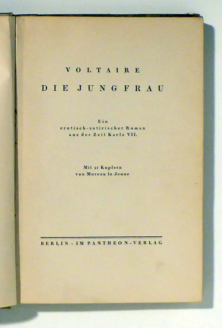 Ein erotisch-satirischer Roman aus der Zeit Karls VII. Mit 21 Kupfern von Moreau le Jeune. Berlin: Pantheon Verlag, 1920. 160, [1] S., mit 21 Kupfern nach Moreau le Jeune auaf Tafeln. Einband: Original-Halbpergament, mit goldgeprägtem Rückentitel in Leder. Format: gr.8°. Nummerierte Ausgabe, Exemplar 418 von 1100, Davon die Exemplare I bis C und 1-300 auf Bütten und mit von Hand abgezogenen Illustrationen. Es ist die erste vollständige Übersetzung in die deutsche Sprache. Als Vorlage für die in Prosa gebrachte Übersetzung des in Versform geschriebenen Originals "La Pucelle d'Orleans" diente Moreck (das ist Konrad Haemmerling) ein nicht gedrucktes Manuskript von Magda Janssen aus der Mitte des 19. Jahrhunderts. Mit dem Ex Libris von Howard Lind Nelson auf dem Innendeckel sowie einem datierten handschriftlichen Vermerk wo und wann er das Buch erworben hat. Für das Ex Libris verwendete er, leicht abgewandelt, das Proust-Zitat "Les vrais paradis sont les paradis perdu".