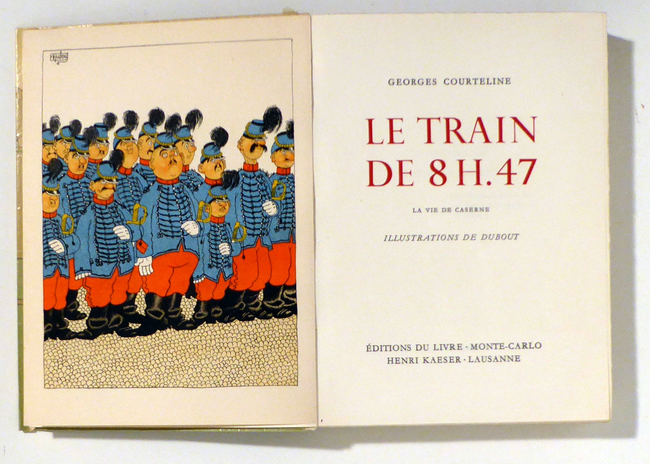 La vie de caserne Illustrations de Dubout. Monte-Carlo; Lausanne: Éditions du Livre; Henri Kaeser, 1951. 195, (2) S., nicht aufgeschnitten, mit 24 farbigen Original-Lithographien von Dubout. Einband: französische Broschur mit transparentem Pergaminumschlag. Format: 8°. Nummerierte Ausgabe, Exemplar 4160 von 5000 auf Grand Velin Crèvecoeur für die Editions du Grand-Chêne, Lausanne. Die Lithographien wurden bei den frères Mourlot abgezogen