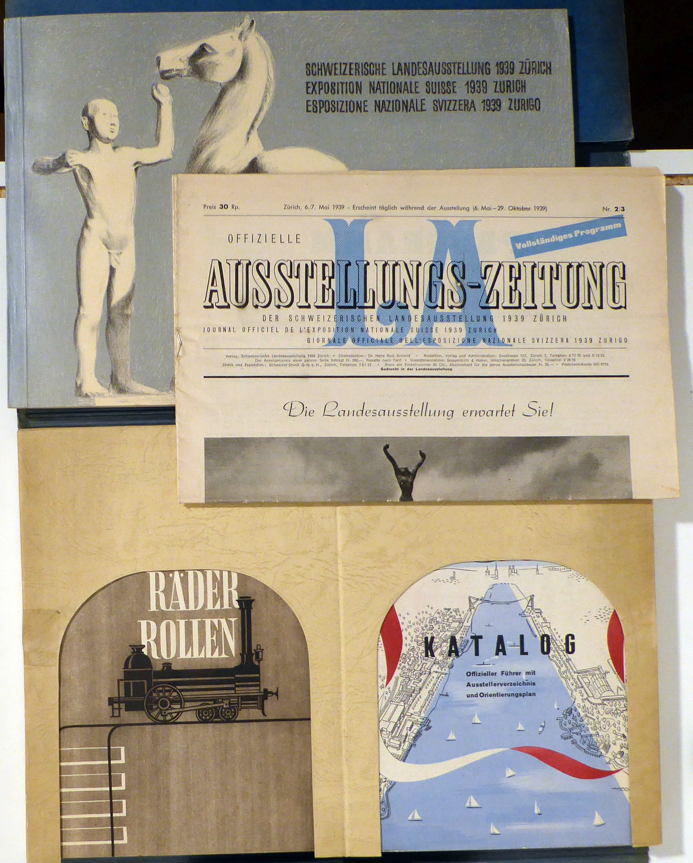 [Pressemappe vom Eröffnungstag 6. Mai 1939]. Zch.: Schweizerische Landesausstellung, 1939. 17teilig, mit zahlreichen Abbildungen nach Fotografien, Dokumenten, Zeicxhnungen und anderen grafischen Vorlagen. Einband: Blaue Pressspan-Mappe mit Druckknopfverschluss. Vollständige Pressemappe vom 6. Mai 1939 (Eröffnungstag) mit folgenden Beilagen: "LA Katalog, Offizieller Führer mit Ausstellerverzeichnis und Orientierungsplan" (mehrfach gefaltet unter Streifband im Hinterdeckel) - "Schaffende Schweiz, Kleine Volks- und Landeskunde" (mit Holzschnitt-Vignetten von Aldo Pattochi und zahlreichen Abbildungen nach Fotografien von Werner Bischof, Theo Frey, Gotthard Schuh, Jakob Tuggener und zahlreichen anderen) - "Die Privatversicherung in der Schweiz. Eine volkstümliche Darstellung der schweizerischen privaten Versicherung und ihrer Darbietungen an der Schweizerischen Landesausstellung 1939 in Zürich" (mit 5 farbigen Tafeln, davon 3 nach Gemälden von Arnold Schär, sowie Zeichnungen im Text von R. Levers) - "Die Räder Rollen. Ein Querschnitt durch 200 Jahre Schweizerisches Verkehrswesen, dargestellt in 7 festlichen Bildern mit Musik und Gesang, verfasst von Otto Schaufelberger" (Textheft mit zahlreichen Abbildungen nach Fotografien und Grafiken) - Schweizerische Landesausstellung 1939 Zürich" (dreisprachiges Album mit 22 mehrfarbigen Abbildungen auf Tafeln vom Ausstellungsgelände, auf dem Umschlag der Jüngling mit Pferd von Pierre Gauchat, 8°, quer) - "Offizielle Ausstellungs-Zeitung" vom 6./7. Mai 1939 - "Führer durch den Interpharma-Pavillon" (gestaltet von Max Sulzbachner) - "Schweizerische Landesausstellung 1939 Zürich" (16seitiges Presseheft mit zahlreichen Abbildungen nach Fotografien von Finsler, Gaberell, Tuggener und zahlreichen anderen, 4°) - "Der Aluminium-Pavillon" (vermutlich von Otto Baumberger gestaltetes doppelseitig bedrucktes DinA4-Blatt mit knapper Inhaltsangabe und Übersichtsplan (je Deutsch und Englisch) - "AL. Aluminium" (mehrfach gefaltetes Leporello (60 x 9,5 cm) mit Übersichtsplan zur Ausstellung, Wegweiser zur Aluminium-Halle und grafischer Darstellung von in der Schweiz aus Aluminium hergestellten Produkten - "Was wir sind" (Werbeprospekt für die Erinnerungswerke "Das goldene Buch der LA" und "Festliche Landi" (gefaltetes Doppelblatt DinA4) - "PTT an der Schweizerischen Landesausstellung in Zürich 1939" (20seitiger Prospekt, kl.8°, quer, mit zahlreichen Abbildungen nach Fotografien und Grafiken - "Cementbulletin. Cement und Beton an der Schweiz. Landesausstellung 1939" (8seitige Broschüre, 8°, mit Abbildungen nach Fotografien - "In Labore Pax" (mehrfach gefaltetes Leporello, 153 x 16,5 cm, gefaltet 22 x 16,5 cm, nach dem von Otto Baumberger gemalten Panorama der Schweizer Geschichte - "Zürich, Verkehrführung und Parkierung" (vom Automobil-Club der Schweiz herausgegebener Stadtplan von Zürich, 30 x 42 cm, mehrfach gefaltet, mit Parkgelegenheiten in Zürich) - "Vor den Toren der Landesausstellung" (mehrfarbiger Faltprospekt, 31 x 20,5 cm, mehrfach gefaltet, mit Ausflugsvorschlägen in die nähere Umgebung von Zürich) - "Das Ereignis der Schweiz im Sommer 1939 - Schweizerische Landesausstellung 1939 Zürich" (von Otto Baumberger gestalteter Vogelschau-Ansicht des Ausstellungsgeländes vom See Richtung Zürich (80 x 21,5 cm, mehrfach gefaltet).