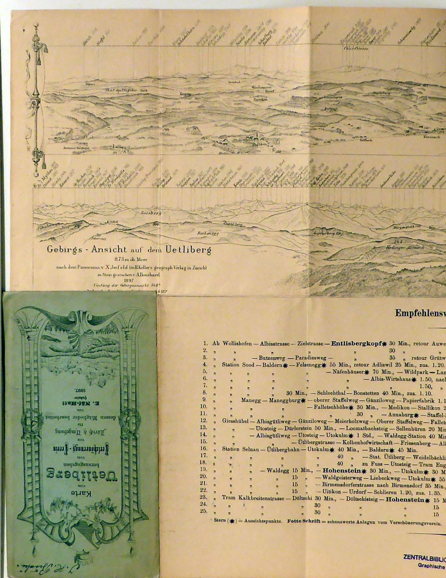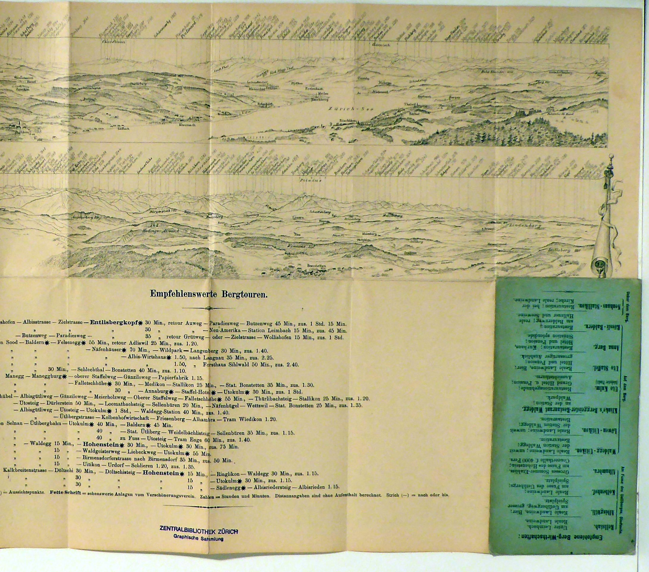 Hrsg. vom Verschönerungs-Verein von Zürich & Umgebung für dessen Mitglieder bearbeit von E. Näf-Hatt. Winterthur: topogr. Anstalt J. Schlumpf, vorm. Wurster, Randegger, 1897. 58 x 18, 5 cm (bxh), fünffach gefaltet, lithographiertes Panorama, aufgeteilt in 2 Teile, nach X(aver) Imfeld, verso mit farbig lithographierter Karte im Massstab 1 : 12500. Einband: Or.kt. Format: 8°. Erstausgabe. Deckelzeichnung mit Zürcher Wappen und stilisierter Bergansicht (Alfred Näf); mit Aufzählung empfehlenswerter Bergtouren und Berg-Wirthschaften
