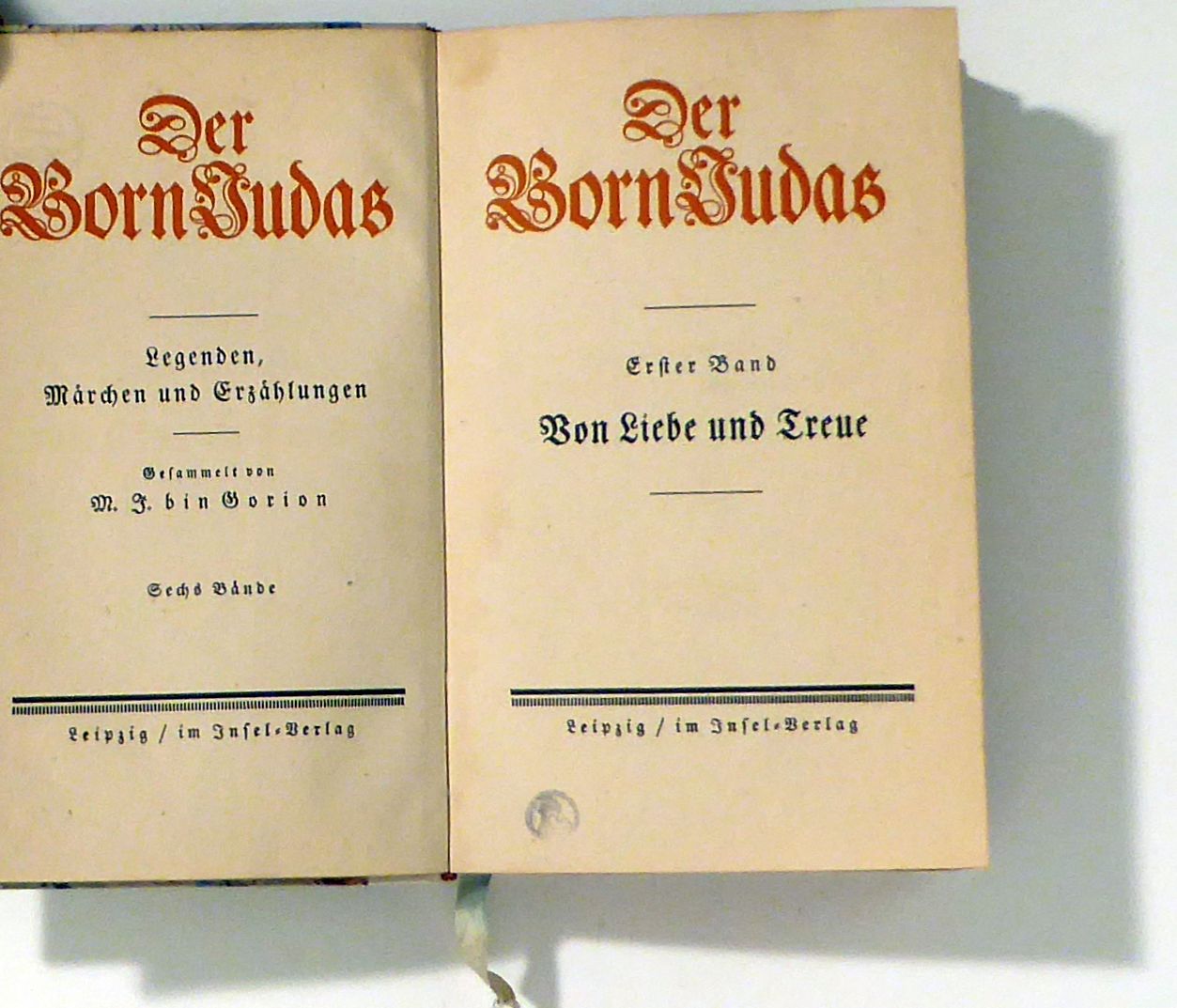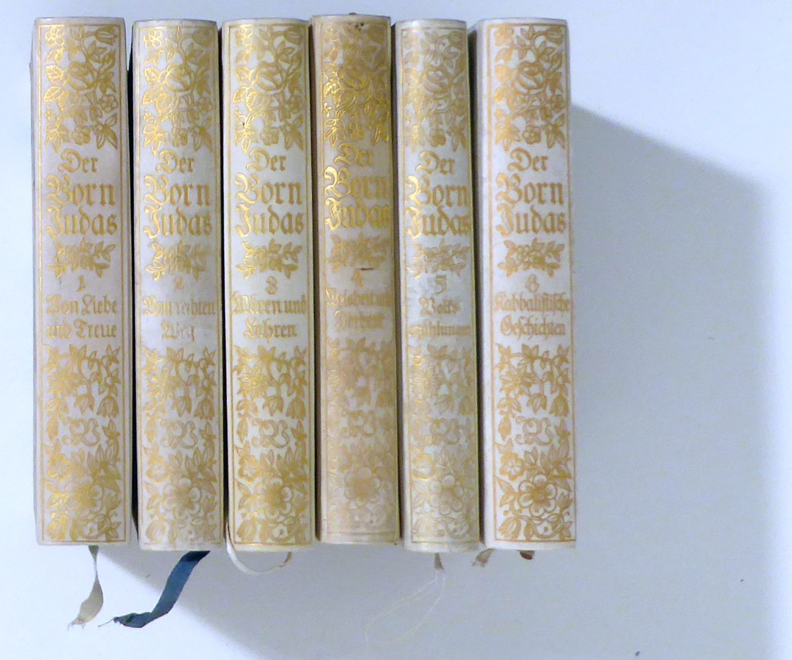Märchen, Legenden und Erzählungen. Hrsg. von M[icha]) J[osef] bin Gorion, übertragen von Rahel Ramberg. Lzg.: Insel, 1924, 1922, 1923. 6 Bde. 400, (1); 375, (1); 337, (2); 288, (3); 347, (1); 343, (1) S. mit Lesebändchen, Einband: Original-Halbpergament, mit Lesebändchen und dreiseitigem Rotschnitt. Format: 8°. Erstausgabe. Sarkowski2, 203. Die erste Ausgabe dieser Anthologie. Hier noch mit ausführlichen Anmerkungen und Quellenangaben. In allen späteren Editionen wurden diese teils weggelassen, teils reduziert. Rahel Ramberg, die Überswetzerin, ehelichte später Micha bin Gorion. Original-Pappbände mit marmorierten Überzugpapieren und Pergamentrücken mit reicher goldgeprägter Verzierung mit Titel und Bandnummer und blauen Vorsätzen. Drucklegung, Typographie und Einbandgestaltung E[mil] R[udolf] Weiss. Band Original-Pappband mit identischen goldgeprägten Mustern auf Rücken. 1. Band: Von Liebe und Treue; Band 2: Vom rechten Weg; Band 3: Mären und Lehren; Band 4: Weisheit und Torheit; Band 5: Volkserzählungen; 6. Band Kabbalistische Geschichten. Alle Bände in erster Auflage, gedruckt in Fraktur