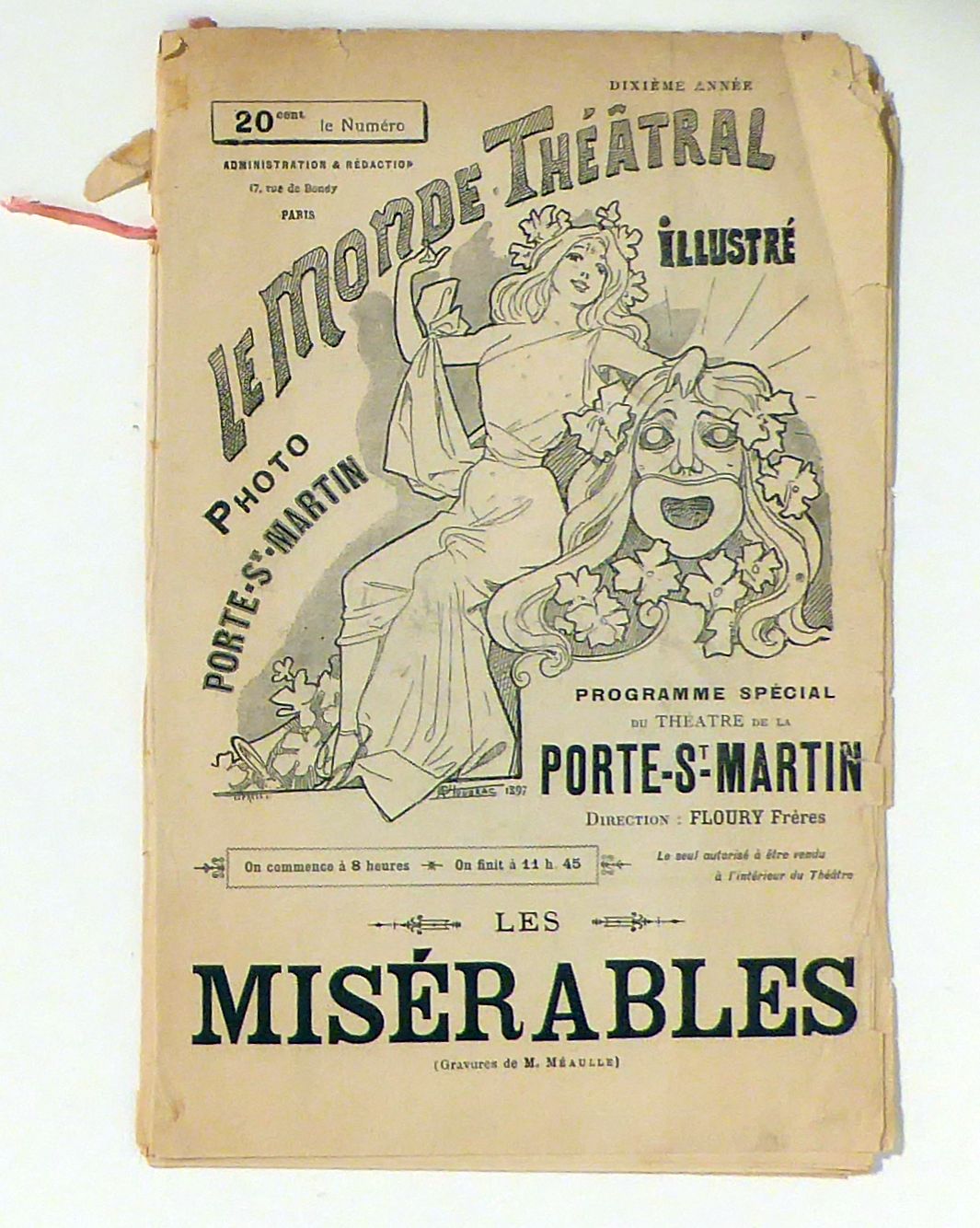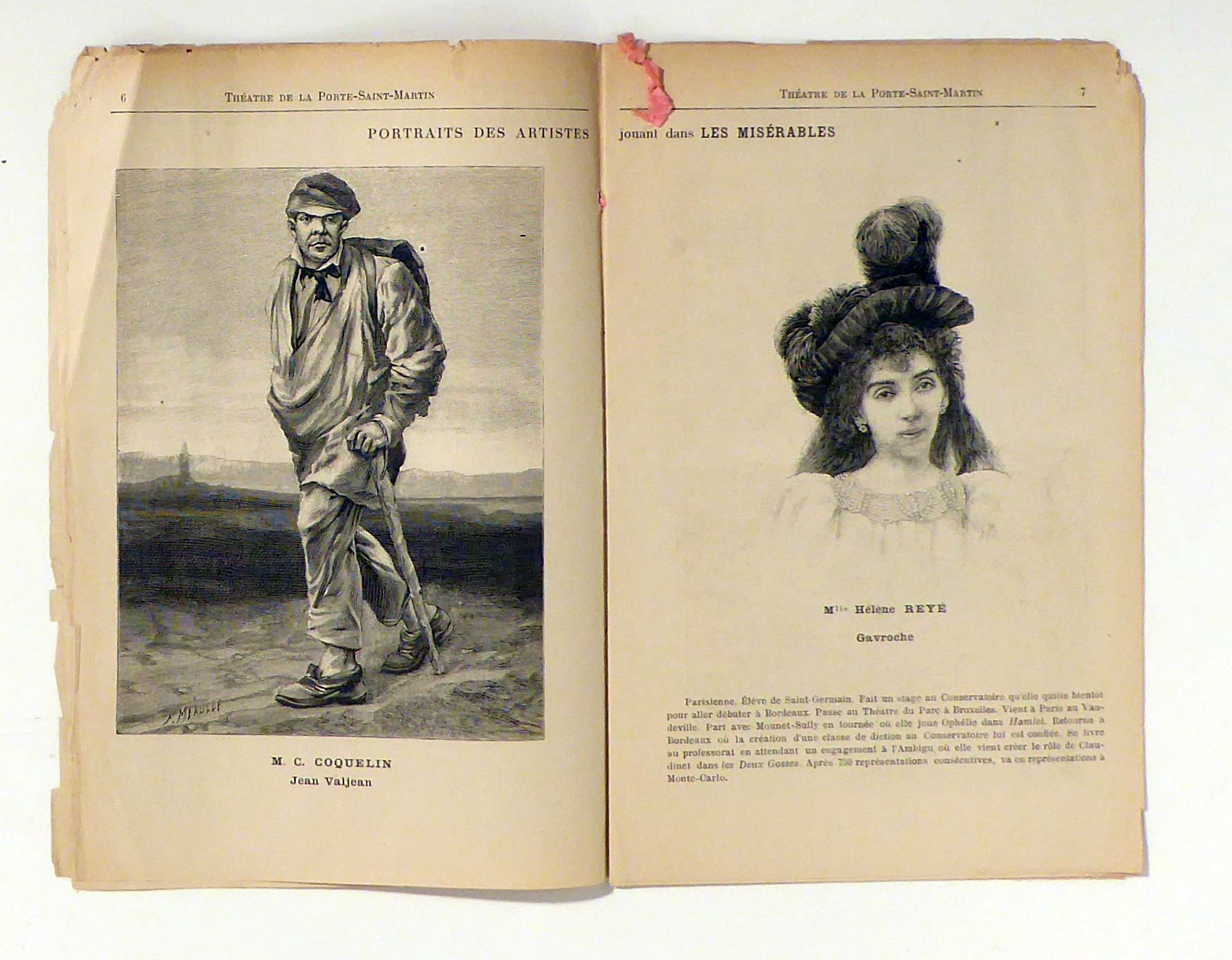 Programmheft für die Inszenierung des Musicals nach dem Roman von Victor Hugo. Regie führten der Sohn des Autors, Charles Hugo und Paul Meurice; Benjamin Constant Coquelin gab den Jean Valjean, Hélène Reyé Gavroche. MIt einer Besprechung der Aufführung von Louis Chalette, einer vollständigen Liste der Besetzung sowie zahlreichen Holzstich-Porträts und Bühnendecors nach Louis Fortuné Méaulle
