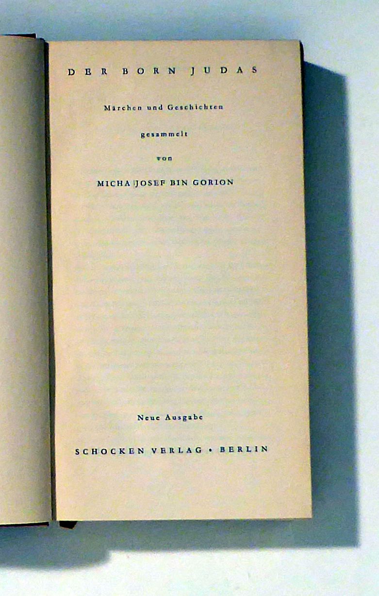 Märchen und Geschichten gesammelt von Micha Josef bin Gorion. Neue Ausgabe. Bln.: Schocken, 1934. 791 S. mit Lesebändchen, Einband: Original-Leinwand. Format: 8°. Dahm 45. Übertragen von Rahel bin Gorion, (geborene Ramberg). Um den wissenschaftlichen Apparat - Varianten, Anmerkungen, etc. - reduzierte Ausgabe. Das Original erschien Ende des ersten Weltkriegs bei Insel in 6 Bänden