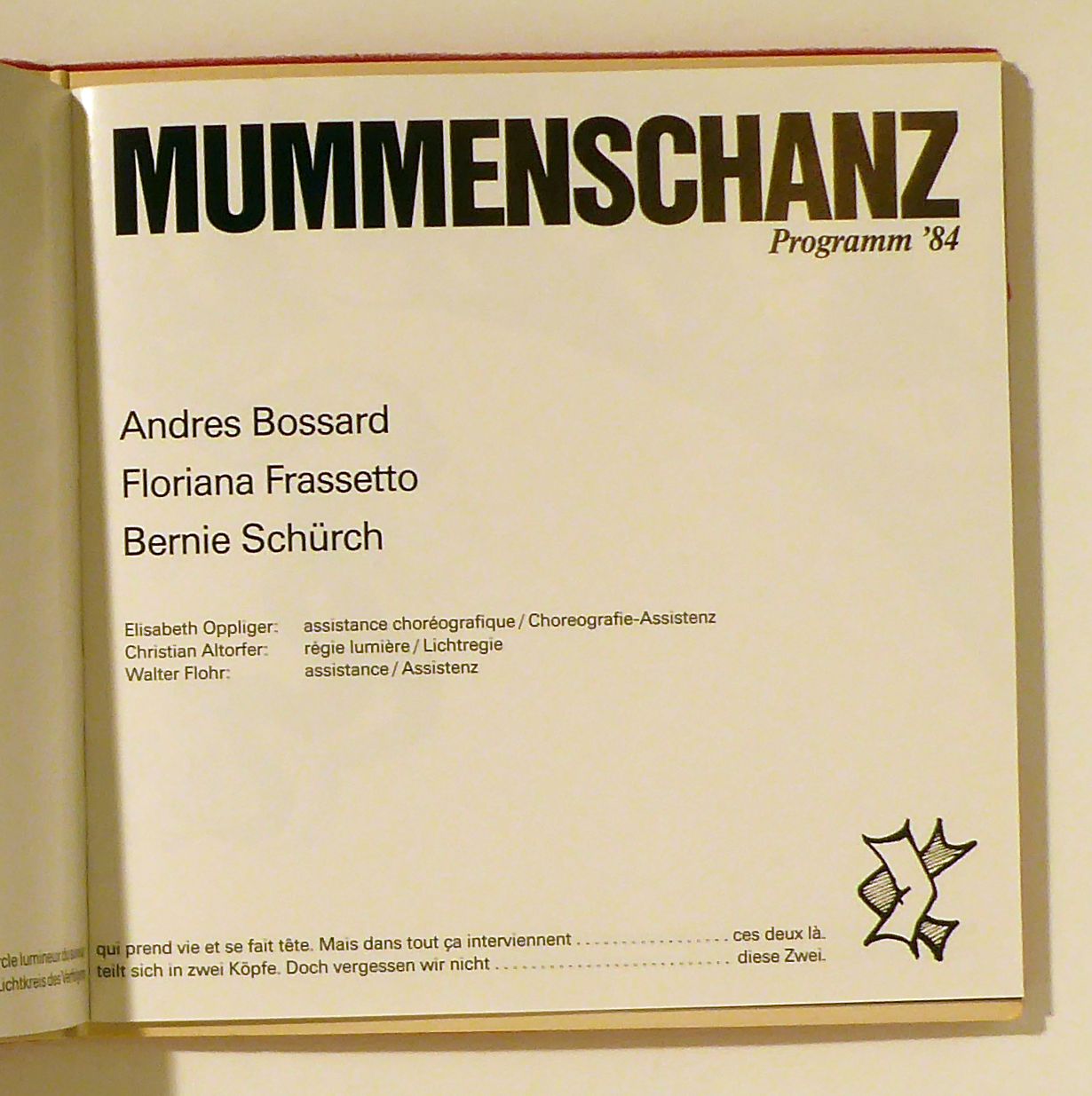 Programm '84. Zch.: 1984. [20] S., mit s/w--Abbildungen nach Fotografien. Einband: Or.kt. mit Schaumstoffüberzug. Format: 8°, quadratisch. Tourneeprogramm der schweizerischen Pantomimegruppe "Mummenschanz" (Andres Bossard, Floriana Frassetto, Bernie Schürich) von 1984; Choreografie-Assistenz Elisabeth Oppliger, Lichtregie Christian Altorfer, Assistenz Walter Flohr. Der Deckel mit rotem Schaumstoffüberzug und, ebenfalls in Schaumstoff, einer blauen Hand, deren Finger über die Deckel greifen und geöffnet werden können