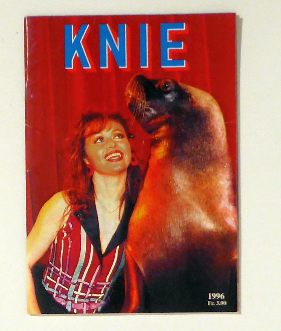 Das Original - L'Authentique. Inszeniert von Fredy Knie jun. und Franco Knie. Rapperswil: (Gebrüder Knie), 1996. 30 Bll., mit zahlreichen, teils farbigen Foto-Illustrationen auf Tafeln und im Text und umfangreichem, illustriertem Werbeteil. Einband: Farbig illustrierter Or.Umschlag, klammergeheftet. Format: 8°. Zweisprachig (deutsch, italienisch) Unter anderem: Kletterakrobatik Ho KOn Ho; Tierkomödie mit Afrikanischen Elefanten und Bernhadinern mit Wendell Huber