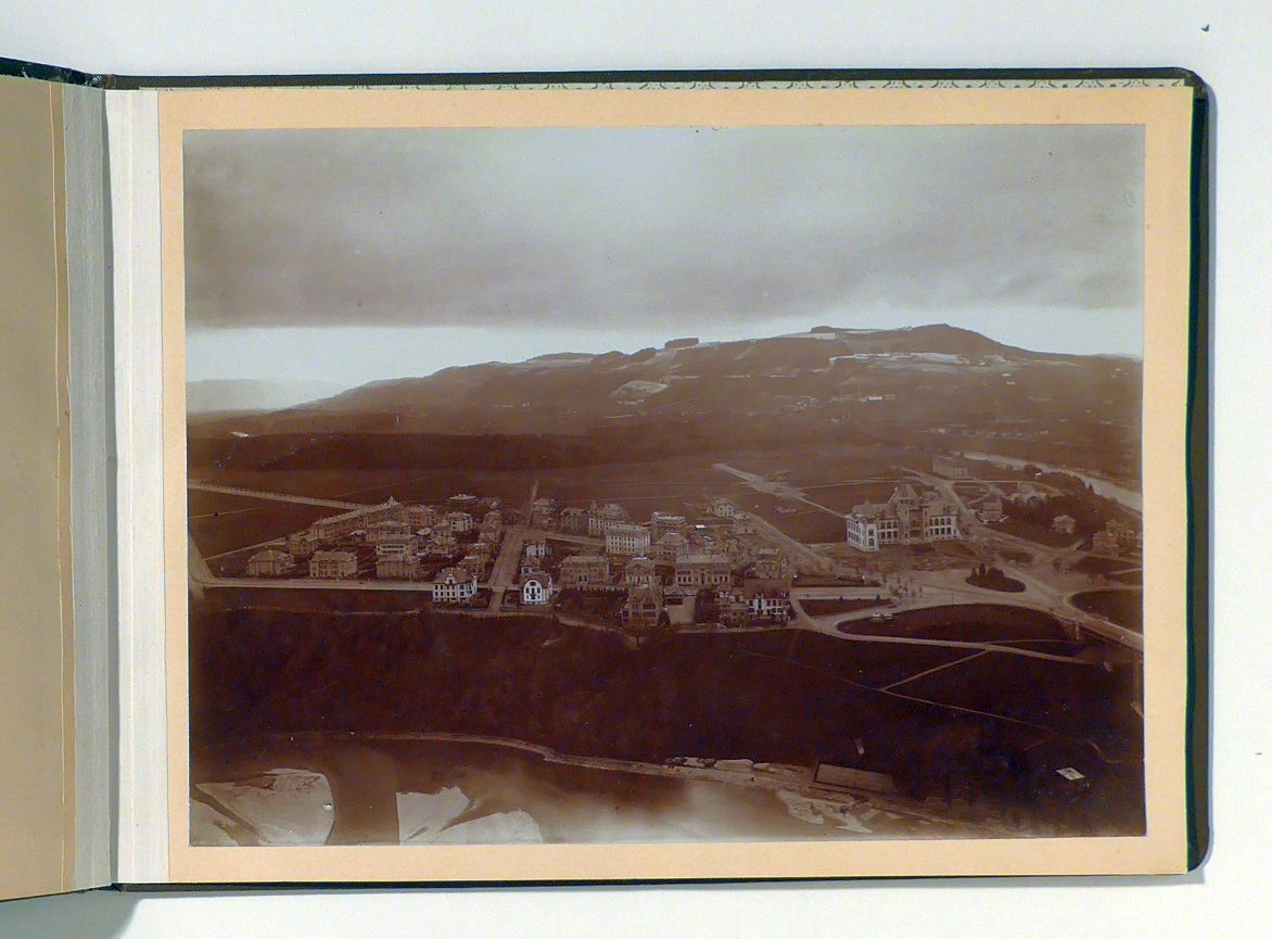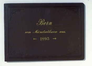 s.n., 1893. 4 Bll., Einband: Or.Ln. Format: 27x19 cm. Erstausgabe. 4 Original-Fotografien (23x17 cm, bxh), aufgewalzt auf Kartontafeln, mit Stadtansichten: Westen: Oberstadt in Richtung Bahnhof - Osten: Altstadt in Richtung Nydeggbrücke - Norden: Rathaus - Süden: Kirchenfeld mit Gurten. Brauner Original-Leinenband mit goldgeprägtem Titel und blingeprägten Verzierungen und einem weissen Innenspiegel mit goldbedrucktem Muster und 2 fadengehefteten eierschalenfarbenen Kartonbogen. Sowohl die Fotografien als auch der Einband sind ohne jeden Hinweis auf den Fotografen, respektive den Verleger. Die Westansicht hat einen vermutlich von der Vervielfältigung herrührenden Lichtstreifen, die drei anderen Bilder, namentlich die Ost- und die Süd-Ansicht sind sehr kontrastreich