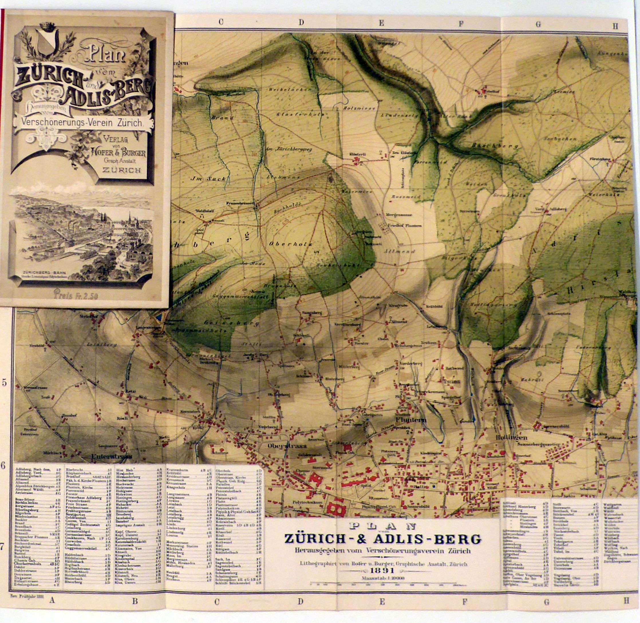 Herausgegeben vom Verschönerungsverein Zürich. Gezeichnet von E. Frtischi, Geom. in Oberstrass. Maasstab: 1:10000. Zch.: Hofer u. Burger, 1891. 1 Bl., mehrfach gefaltet, Einband: Or.Hlwd.-Mappe. Format: 56 x 42 cm (bxh); gefaltet 13 x 21 cm. Erstausgabe. Hauri (Hofer & Burger) 331. Lithographierte Karte. Auf der Vorderseite der Mappe eine Abbildung der Altstadt von Zürich mit der Zürichberg-Bahn [heutige Polybahn] und auf der Rückseite der Mappe eine Abbildung des Waldhaus Degenriet sowie ein Panorama. Unten links Anmerkung "Rev. Frühjahr 1891"