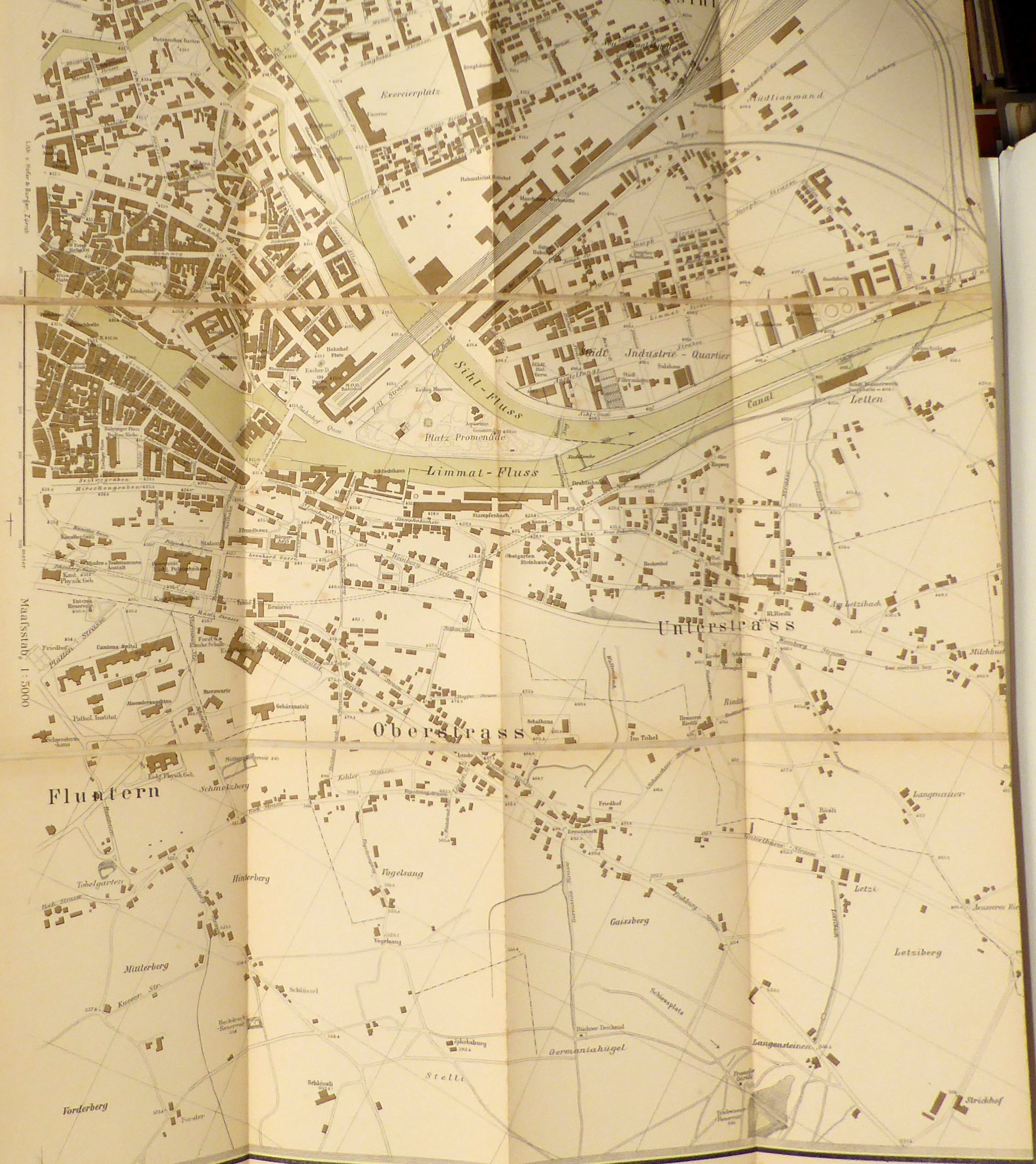 In 4 Blättern. Maasstab 1:5000. Blatt III: Stadt, Unterstrass, Wipkingen, Oberstrass, Fluntern. Zch.: Hofer & Burger, [um 1890]. 1 Bl., mehrfach gefaltet, Einband: Klappenmappe in Karton mit schmalem Leinwandrücken. Format: 82 x 60 cm (bxh); gefaltet 13 x 22 cm. Lithographierte Karte. Blatt 3 (von 4). Mit den Quartieren Aussersihl, Fluntern, Oberstrass, Unterstrass und Wipkingen. Die Karte ist undatiert. Sie war vermutlich zur Veröffentlichung anlässlich der ersten Stadterweiterung von 1892 geplant. Nicht bei Hauri (Hofer & Burger)