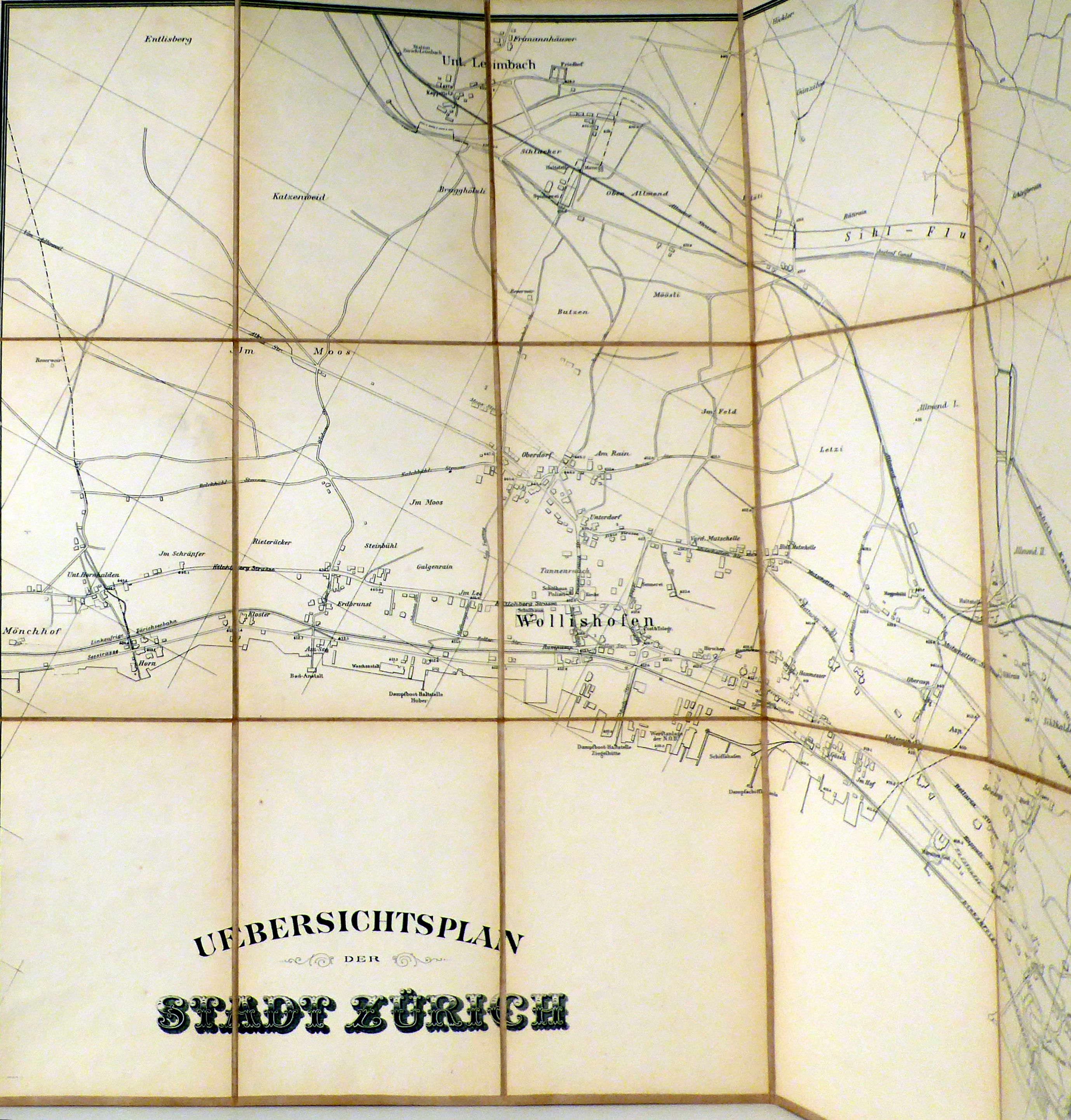 Uebersichtsplan der Stadt Zürich. Zch.: Hofer & Burger, [um 1890]. 1 Bl., mehrfach gefaltet, Einband: auf Leinwand aufgezogen mit Titelschild. Format: 82 x 58 cm (bxh); gefaltet 14 x 20 cm. Auf Leinen aufgezogene lithographierte Karte. 1 Blatt von insgesamt 4 Blättern. Mit den Quartieren Unter-Leimbach, Wollishofen und Enge. Die Karte, eine Version des später veröffentlichten vierteiligen Plans "Offizieller Neuer Uebersichts-Plan von Zürich und Umgebung" ist undatiert. Sie war vermutlich zur Veröffentlichung anlässlich der ersten Stadterweiterung von 1892 geplant. Nicht beiHauri (Hofer & Burger)