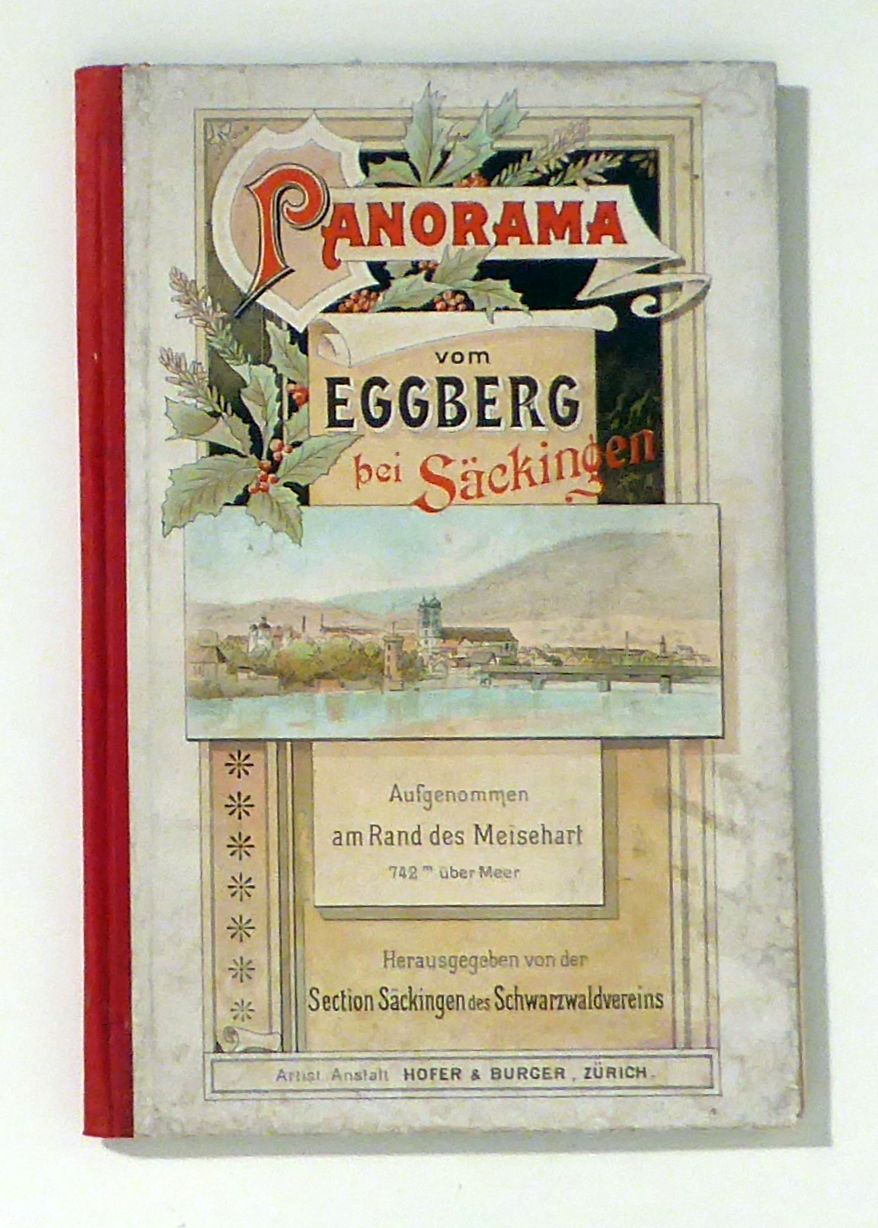 Hochgebirg aufg. von X[aver] Imfeld, Ingenieur, Zürich. Herausgegeben von der Section Säckingen des Schwarzwaldvereins. Bergbestimmungen im Jura von P. A. Streicher. Zch.: Hofer & Burger, [1892]. 1 Bl., mehrfach gefaltet, Einband: Klappenmappe, Original-Halbleinwand. Format: 277 x 21 cm (bxh); gefaltet 14 x 21.5 cm. Erstausgabe. Hauri (Hofer & Burger) 444. Koloriertes, lithographiertes Panorama. Es handelt sich dabei um die Original-Ausgabe von 1892. Umschlagtitel: Panorama vom Eggberg bei Säckingen. Aufgenommen am Rand des Meisehart, 742 m über Meer. Vignette von Säckingen auf Umschlag-Vorderdeckel, Abbildungen vom Bad-Hotel Säckingen sowie vom Gasthof zum Schützen auf Umschlag-Hinterdeckel. Gipfel mit Namen und Höhenangabe, Ortschaften mit Namen und teilweise mit Höhenangabe