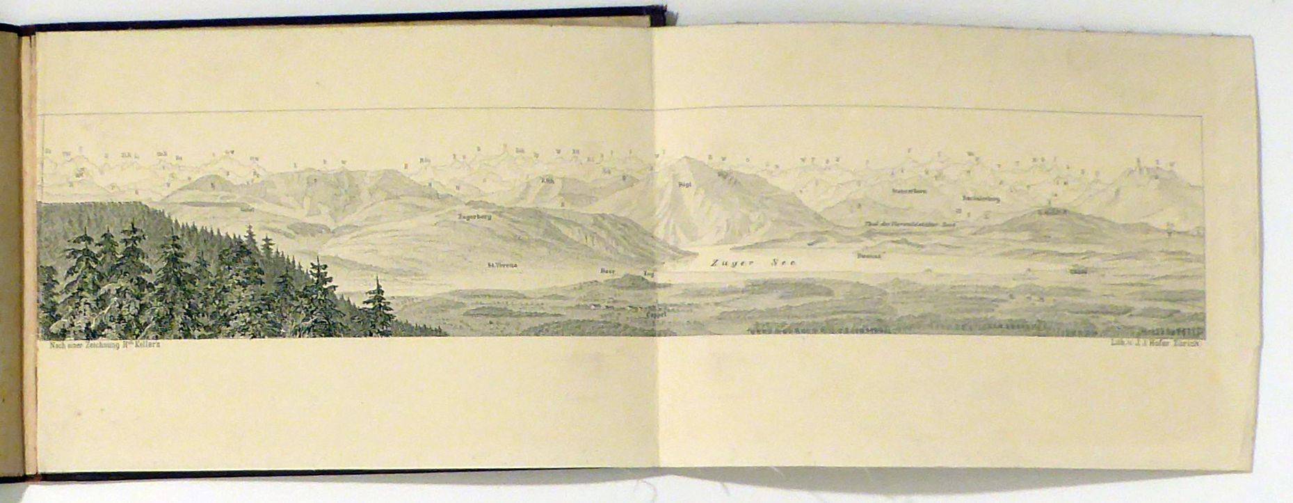 Zch.: J. J. Hofer, [1871]. 1 Bl., mehrfach gefaltet, Einband: Hlwd.-Mappe. Format: 72.5 x 13 cm (bxh), gefaltet 18.5 x 13.5. Erstausgabe. Probedruck des in Hauri (Hofer & Burger) 432 beschriebenen Panoramas. Die Gipfel sind, im Gegensatz zur definitiven Version, noch nicht mit Namen beschriftet sondern nur mit einem Buchstaben. Exemplar aus dem AYrchiv von Hofer & Burger.