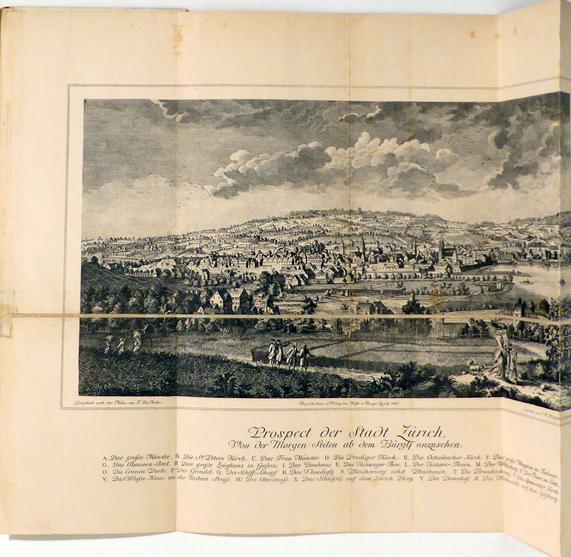 Erstausgabe. Historisches Panorama der Stadt Zürich. Die wichtigsten Gebäude der Stadt sind mit Buchstaben markiert. Unterhalb des Panoramas befindet sich eine entsprechende Legende. Das Titelfeld der Klappenmappe ist noch nicht bedruckt, es ist lediglich handschriftlich der Zeichner Johann Jacob Koller vermerkt