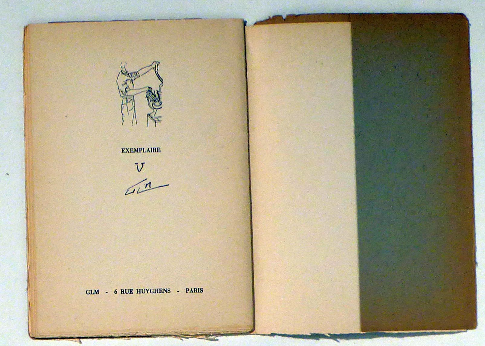 Paris: La Presse à main, 1947. [20] S., mit 1 Vignette - Drucker an der Handpresse - im Kolophon und einer Vignette - Stacheldraht - auf dem Umschlag und auf jeder Seite. Einband: Or.kt., lose Bogen, mit Schutzumschlag. Format: 4°. Erstausgabe. Coron 249. Nummerierte Ausgabe auf vélin du Marais. Eines der 25 von Guy Lévis Mano im Kolophon eigenhändig signierten und nummerierten Exemplare. Das Exemplar "U". Darüber hinaus gab es noch 125 arabisch nummerierte Exemplare. Die Gesamtauflage beträgt 150 nummerierte Exemplare. Titel im Impressum "Captivité de la verge". Nicht geheftet, 5 bedruckte Bogen, eingelegt in einem nichtbedruckten Bogen, in einem bedruckten grauern Umschlag. Äusserst selten