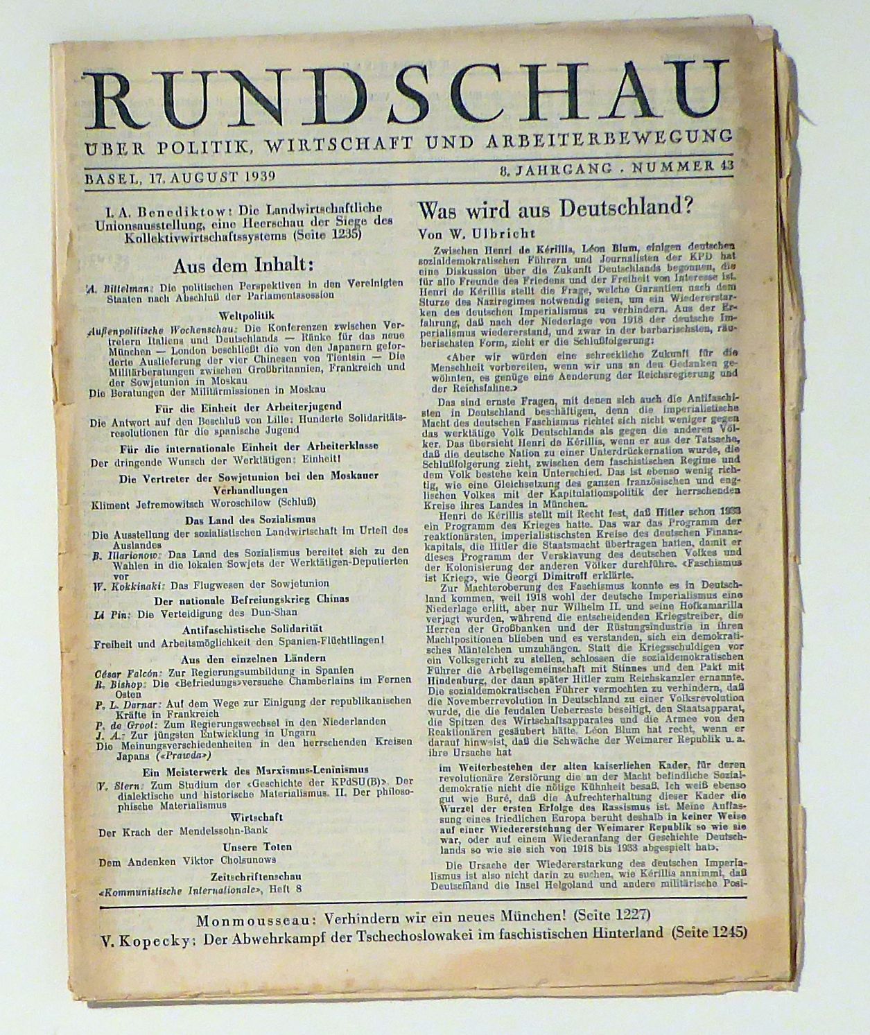 Nachfolgeorgan der Internationalen Pressekorrespondenz (Inprekorr), verantwortlicher Herausgeber war Otto Schudel. Mit einem Beitrag von Walter Ulbricht: Was wird aus Deutschland?