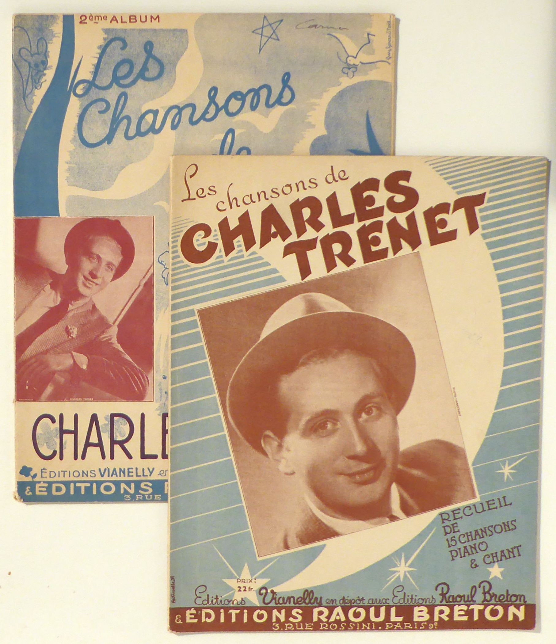 Paris: Breton, 1937; 1939. 2 Hefte: 33, 37 S., Einband: Original broschiert. Format: 4°. Vol. I: Y’a d’la joie ; J’ai ta main ; Tout me sourit ; En quittant une ville ; Je chante ; Bateau d’amour ; Miss Emily ; Rendez-vous sous la pluie ; Le Grand Café ; Valse des amours passés ; Polka du roi ; Annie Anna ; Fleur bleue ; Pigeon vole ; Vous oubliez votre cheval; Vol II: La vie que va; Vous êtes jolie; Ah! Dis Ah!, Dis Ah! Dis Ah! Bonjour; Amour, amour; J'ai connu de vous; Boum; Il pleut dans ma chambre; La vieille; Sérénade portugaise; La chanson des amoureux; Ménilmontant; Quand j'étais p'tit; Les oiseaux de Paris; La route enchantée