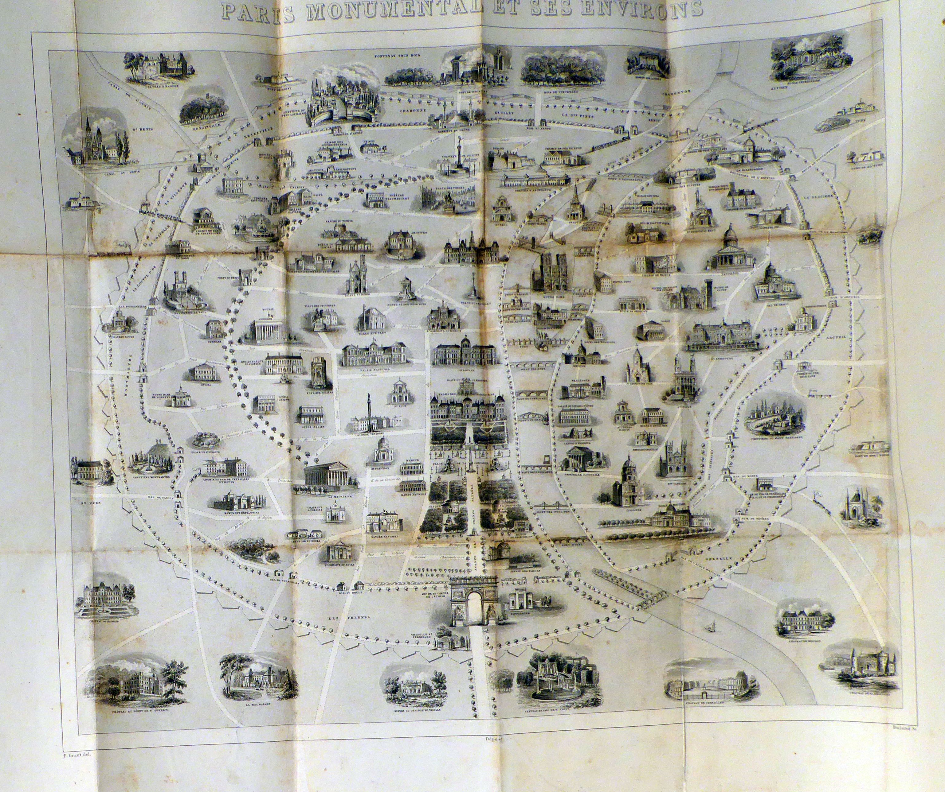 E. Grant del. Buland, sc.. Paris: Imprimérie Drouart, [1855]. 60 x30 cm (bxh); gefaltet 11x16 cm, Einband: Original-Pappband. Format: kl.8°. Plan der Stadt Paris, eingebunden in eine Pappmappe mit tintenschwarzen und reich blindgeprägten Überzugspapieren. Der Plan reicht vom Bois de Vicennes im Norden bis nach Saint Cloud im Süden und von St. Ouen im Westen zu Mont Rouge im Osten. In Aufsicht und detailreich eingezeichnet die wichtigsten Bauten und übrigen Sehenswürdigkeiten. Von den Strassen sind ordnend lediglich die wichtigsten eingezeichnet und auch dies nur rudimentär. Sehr attraktiv