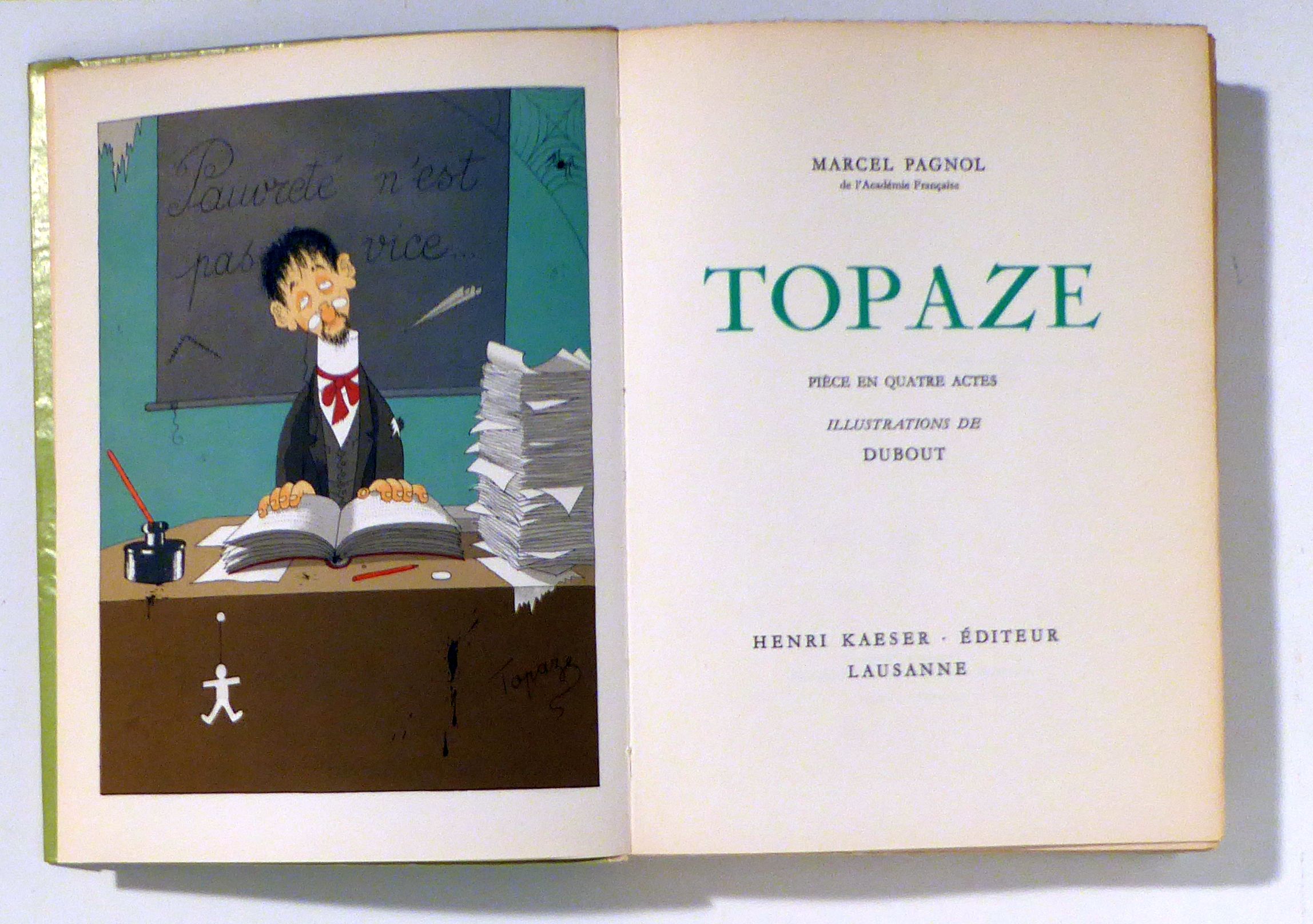 Pièce en quatre actes illustrations de Dubout. Lausanne: Henri Kaeser, 1952. 265, [2] S., nicht beschnitten, mit zahlreichen lithographierten Illustrationen, farbig auf Tafeln und schwarz/weiss im Text. Einband: französische Broschur mit Pergaminumschlag. Format: 8°. Nummerierte Ausgabe, Exemplar 371 von 1000 auf velin blanc im Auftrag der Éditions du Grand-Chêne, Lausanne. Die farbigen Lithographien wurden bei den Frères Mourlot abgezogen. In gleicher Ausstattung wie die drei Jahre früher bei den Editions du Livres erschienenen Bände Marius, Fanny und Cesar. Lindengrüner Umschlag mit transperentem Pergaminumschlag