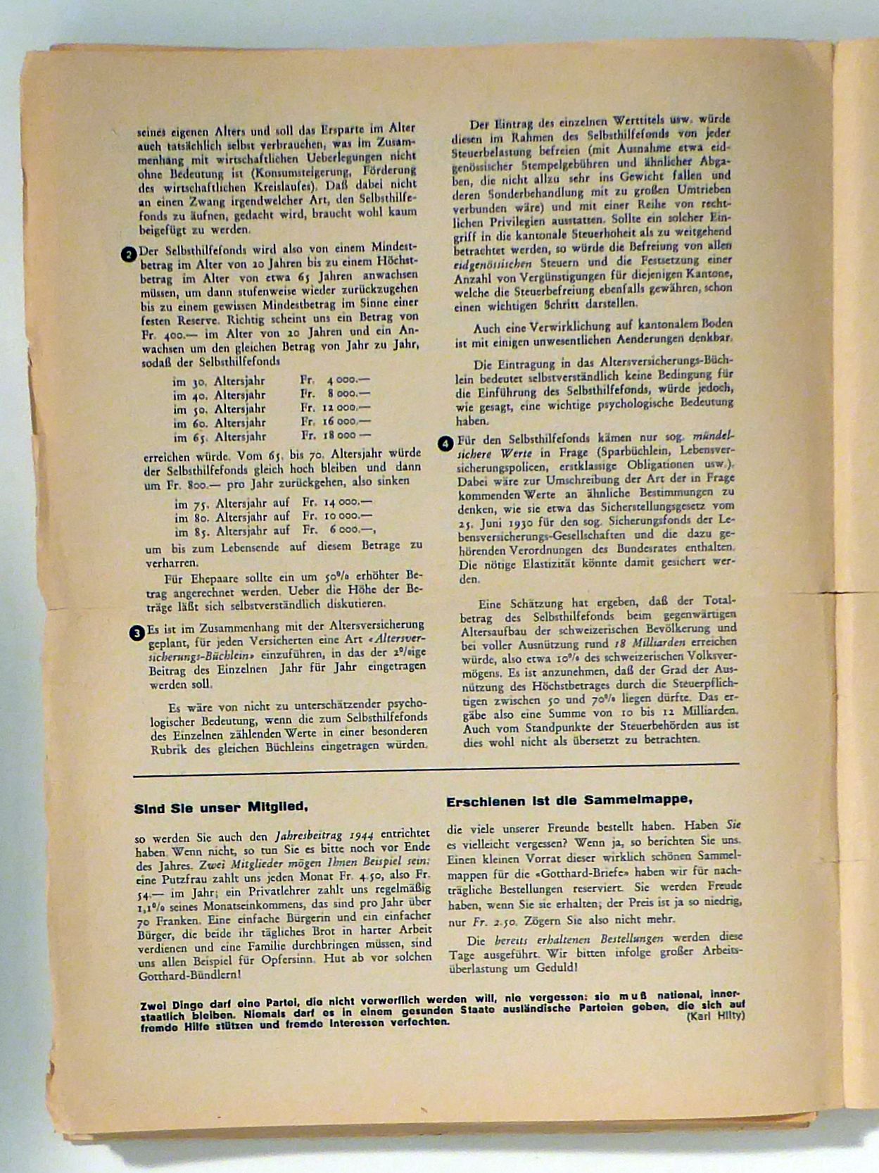 Zch.: [Gotthard-Bund,] Bundessekretariat, 1944-1968. Einband: lose Bogen. Format: 4°. Mitteilungsblatt des 1940 bis 1969 bestehenden Gotthardbundes, der zur "Stärkung des Willens zur Landesverteidigung" und zur "Überwindung der Interessengegensätze" gegründet worden war. Zu dessen Programmpunkten gehörten die "Forderung nach einer autoritären Demokratie, einer korporativen Wirtschaftsordnung und einer Neuordnung des politischen Systems" (HLS). Die Organisation, respektive seine Mitteilungsblätter saind ein typisches Produkt der "geistigen Landesverteidigung" aus der Zeit des Zweitern Weltkriegs und daran anschliessend, des Kalten Krieges. Von den insgesamt über rund 330 erschienenen Nummern des "Gotthard-Briefes" liegen hier die folgenden rund 70 Ausgaben vor: 91 (1944), 97, 100 (französische Ausgabe), 106/107, 110-115, 117-126,129/130, 131, 134, 135/136, 139, 140/141, 143, 145, 146, 148, 152, 155, 158-160, 162, 166, 177, 180, 181/182, 191, 196, 242, 266, 268, 269, 271-274, 278, 286, 296, 298, 313, 316, 319, 321-323, 325-330 (1968)