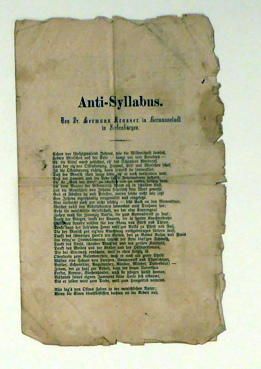 Von Dr. Hermann Krasser in Hermannstadt in Siegenbürgen. Braunschweig: W. Bracke jr., um 1870. [4] S., Einband: loser Bogen. Format: 8°. Vermutlich eine der ersten Versionen als Separata. Erstmals war das Gedicht 1969 in den "Siebenbürgischen Blättern" abgedruckt worden. Selten, gedruckt in Fraktur
