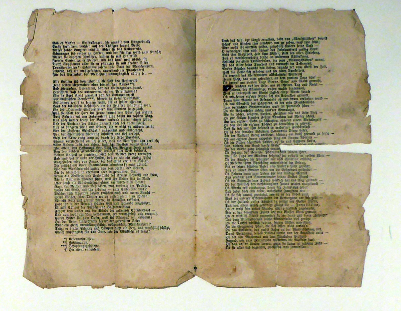 Zustand: Angestaubt, etwas braunfleckig und mit Feuchtigkeitsflecken. An den Rändern mit Fehlstellen, in den Falzen mit Bruchstellen