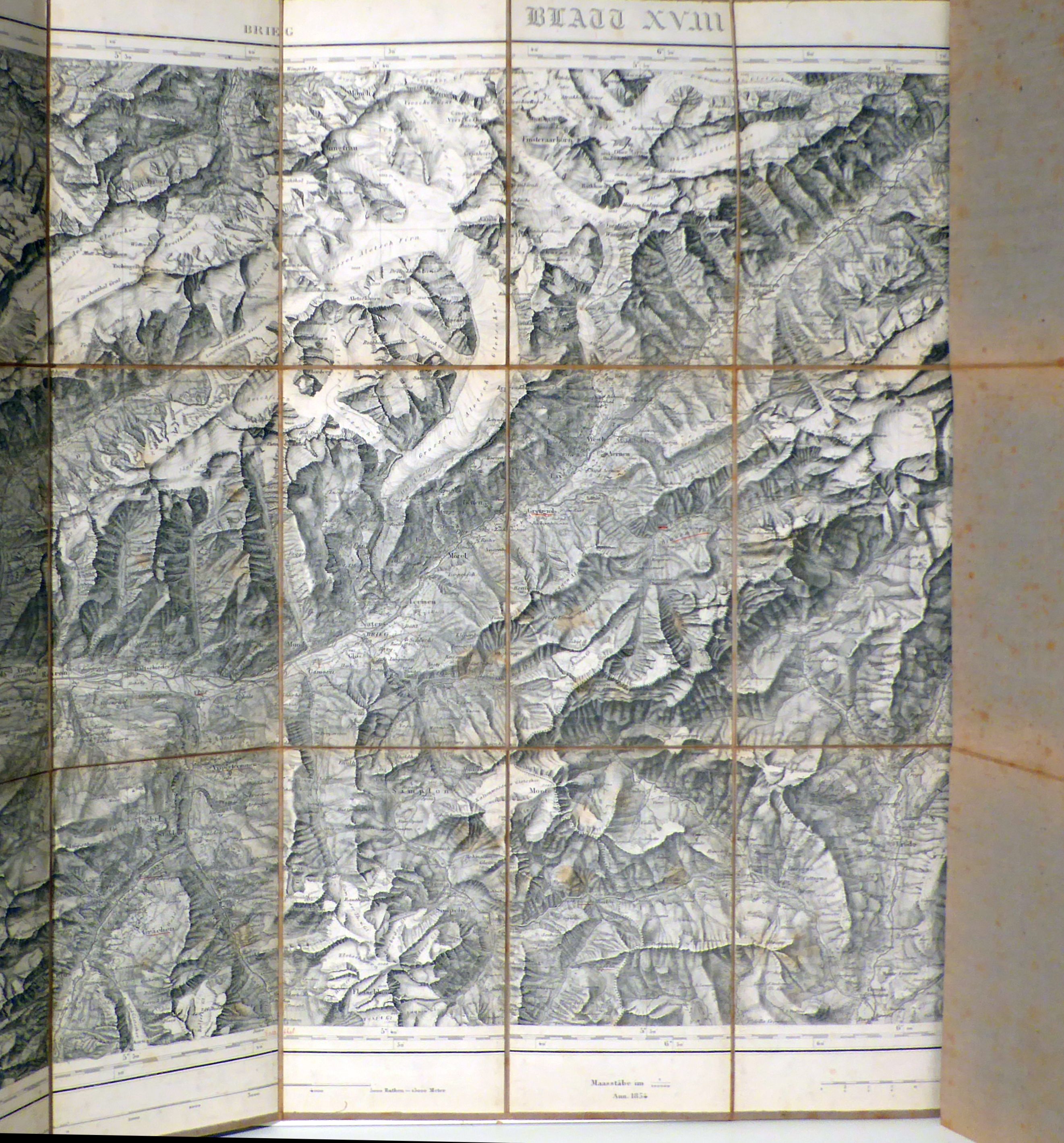 Blatt XVIII Brieg Airolo, Masstab 1:100 000. o.O.: Henri Koegel, 1866. Blatt, mehrfach gefaltetlt, Einband: auf Leinwand aufgezogen. Format: 80 x 56 cm (bxh); gefaltet 11 x 19 cm. G[uillaume]-H[enri]. Dufour direxit, H[einrich ] Müllhaupt sculpsit, H[enri] Koegel imp. Aufnahme von 1854, mit Nachträgen von 1866. Das Original noch in Kupfer gestochen, ob die Platte beim Nachtrag von 1866 bereits verstahlt war, liess sich nicht ermitteln.Im Fuss sind ein Massstab mit 5000 Ruthen_15000 Meter und einer mit 3 Stunde = 48 000 Schw[eizer] Fuss abgedruckt