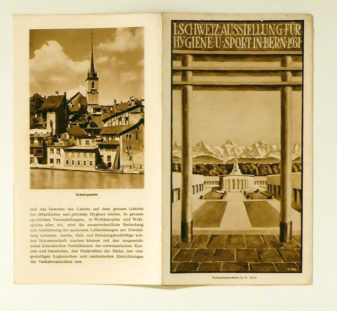 Zentrum für Alpenflüge. Bern: Verkehrsverein der Stadt Bern, 1930. mehrfach gefaltet, mit 9 Abbildungen nach Fotografien sowie einem kleinen Übersichtsplan in Sepia. Einband: Einblatt. Format: 71 x 21,5 cm, 12 x 21,5 cm. Doppelseitig gedruckter Prospekt veranstaltet anlässlich der ersten schweizerischen Ausstellung für Hygiene und Sport vom 19. Juli bis 14. September 1931. Nebst einem Text zu dieser Ausstellung, eine Liste der Hotels und Pensionen, Hinweise zu touristischen Angeboten und eidgenössischen Behörden sowie ein allgemeiner Text zur Stadt und ihren Attraktionen. Bemerkenswert ist der deutliche Hinweis "Zentrum für Alpenflüge" auf dem Titelblatt - im Prospekt werden dafür nur zwei Zeilen in den Angeboten aufgewendet. Wer Gestalter von Titelblatt und Rückseite des Prospekts, mit dem Monogramm "E. HRll." ist, konnte nicht ermittelt werden