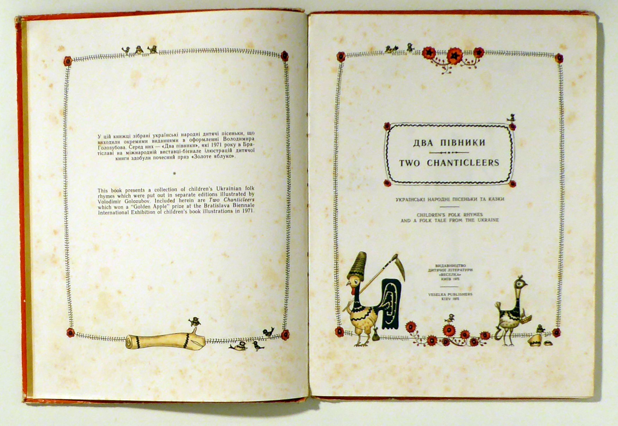 ukraïnski narodni pisenʹki ta kazka. Kiev: Veselka, 1975. 76, [4] S., mit zahlreichen ganzseitigen farbigen Illustrationen nach Zeichnungen von Volodimir Golozubov. Einband: Original-Pappband. Format: 4°. Volkstümliche Verse, Paralleltext ukrainisch - englisch. Ein Teil der Illustrationen wurde 1971 mit dem ersten Preis an der Biennale der Kinderbuchillustration ausgezeichnet