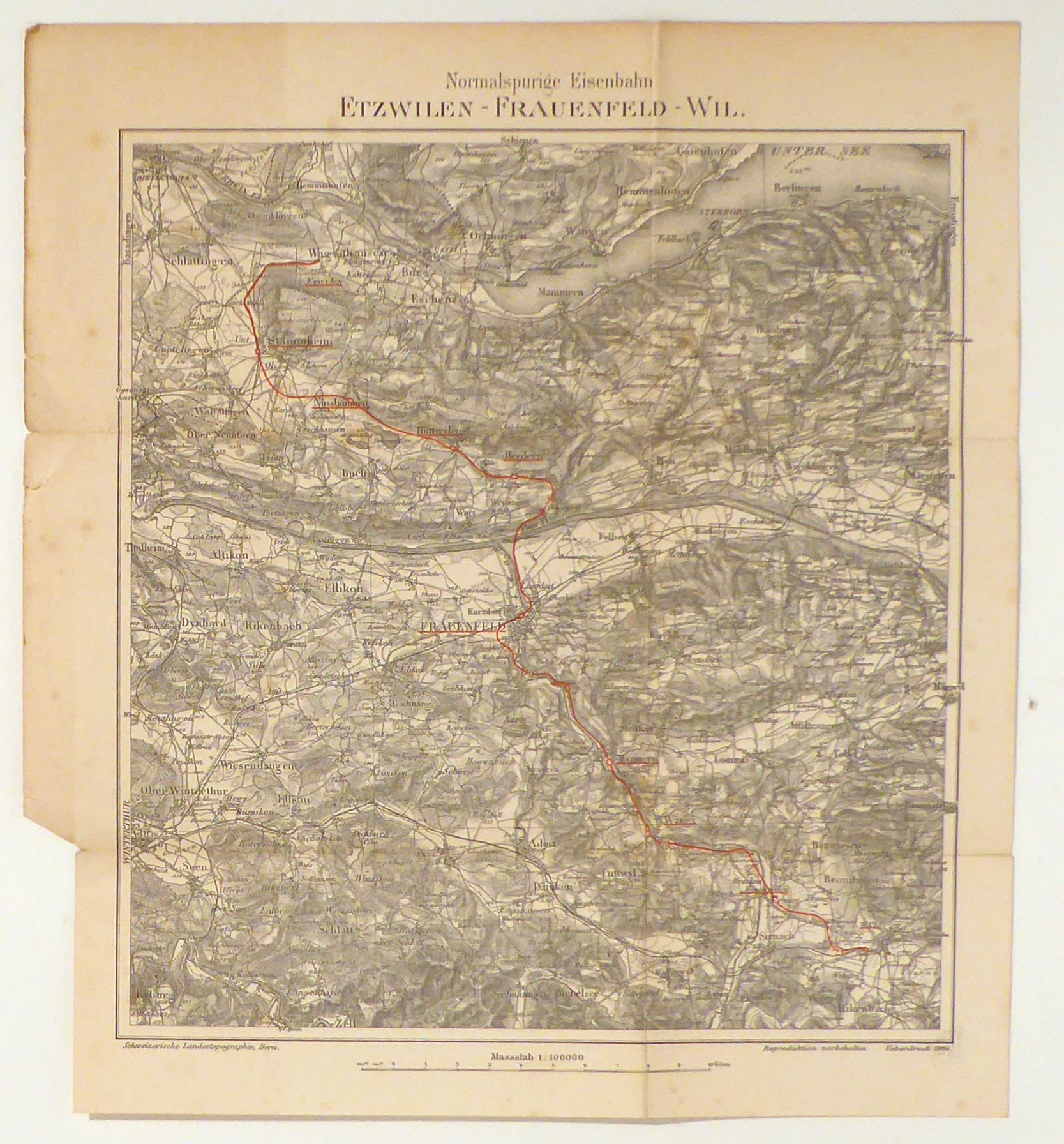 o.O.: o.V., 1904. 1 Blt., Einband: Einblatt. Format: 29,5 x 34 cm (bx), mehrfach gefaltet. Ueberdruck einer Karte im Massstab 1:100000 (Dufour-Atlas); darin eingezeichnet mit roter Farbe die Linie der Bahn von Wagenhausen über Hüttwylen, Frauenfeld und Mazingen nach Wyl (heute Wil)
