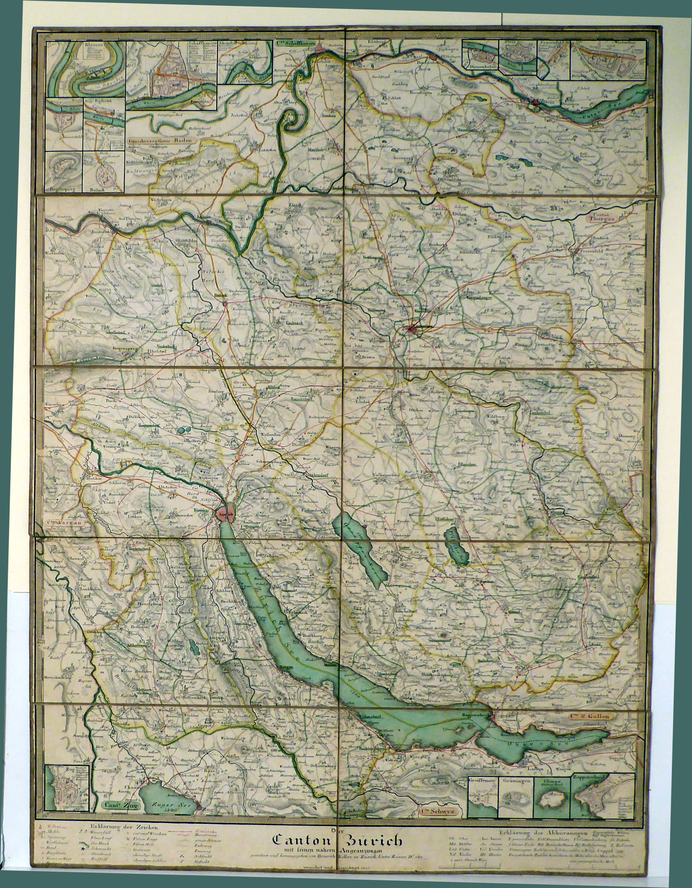Gezeichnet und herausgegeben von Heinrich Keller in Zürich. vermehrt und berichtigt 1845. Zürich: Verlag bei Hch. Keller, 1845. 1 Blatt, Einband: Einblatt, in Steckschuber. Format: 40 x 55 cm (bxh), mehrfach gefaltet. Grenzkolorierter Kupferstich auf Papier, auf Leinwand aufgezogen. Mit 16 Detailplänen an den Rändern und einem auf den Leinwandrücken montierten Plan der Stadt Zürich; darin eingetragen in Deutsch und Französich Aussichtspunkte und Gasthöfe. Gezeichnet und herausgegeben von Heinrich Keller, Zürich. Titel auf dem Schuber: Keller's Karte des Cantons Zürich Q. Km 1723. Ausgabe von 1845. Zürich im Verlag bei Hch. Keller