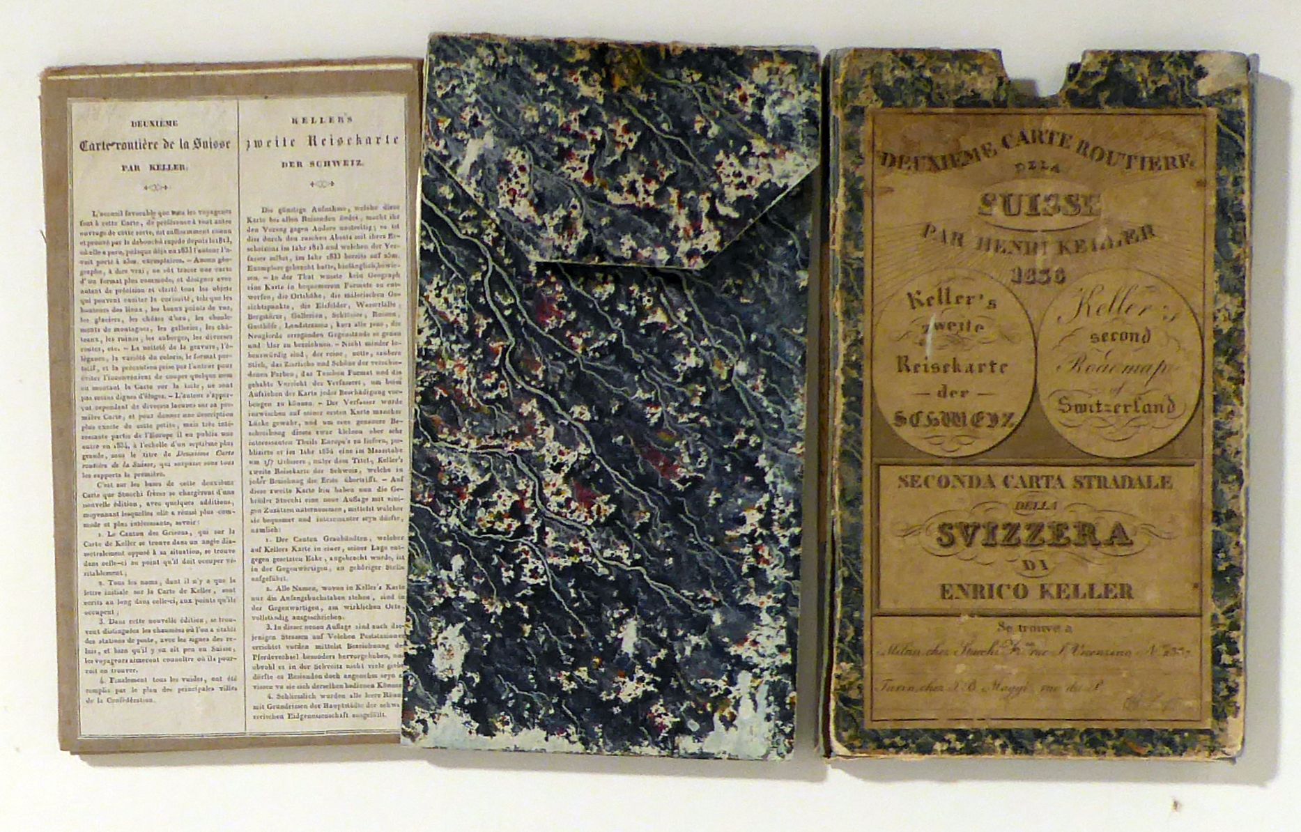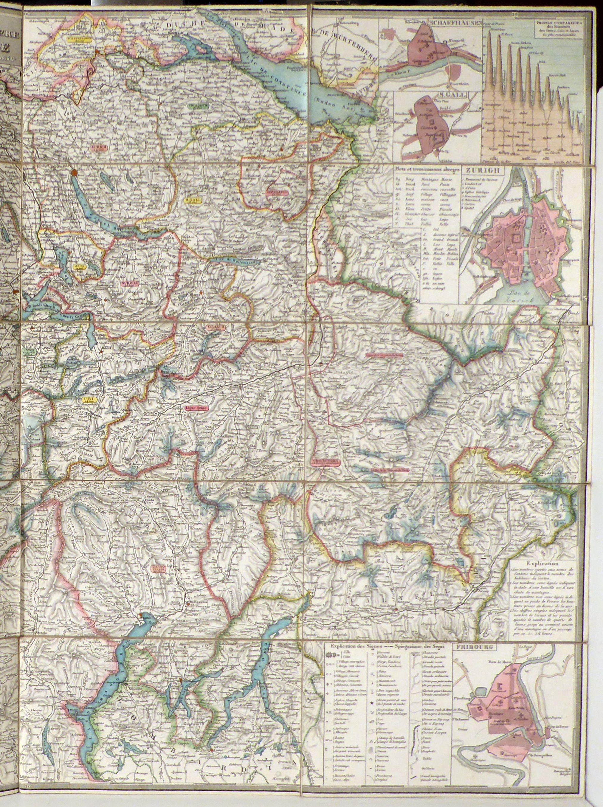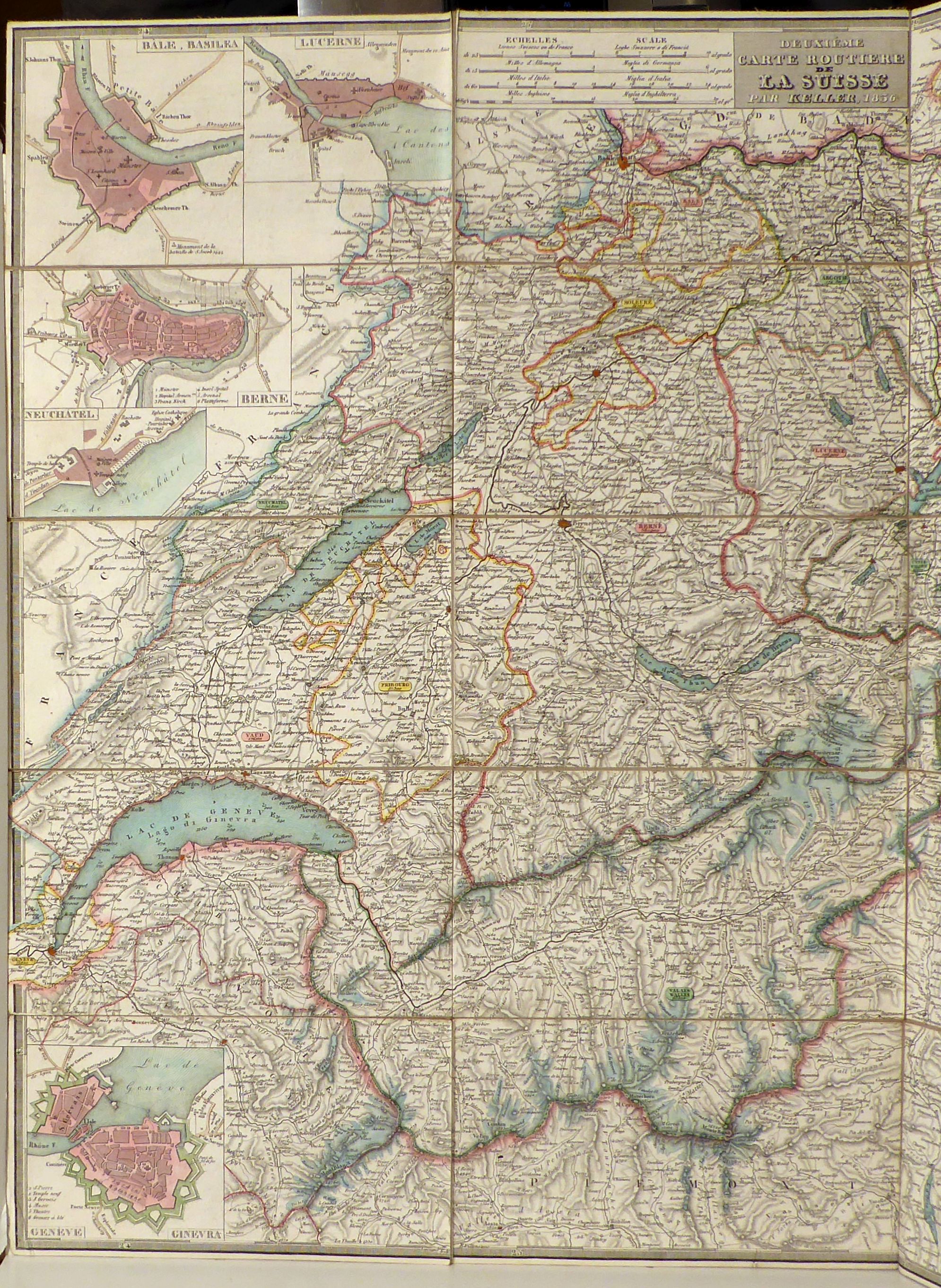 o.O: o.V., 1836. 1 Blt., Einband: 20teilig, auf Leinwand aufgezogen. Format: 77 x 53 cm (bxh), mehrfach gefaltet. Eine eher seltene Ausgabe der zahlreichen Variationen der zweiten Keller'schen Reisekarte der Schweiz in französischer Sprache. Mehrfarbig handkoloriert, ohne Hinweis auf den Stecher Samuel Johann Jakob Scheurmann. An den Rändern 9 Stadtpläne, eine Massstab-Tafel und eine Höhentafel sowie Tafeln mit Erklärung der Symbole und Abkürzungen, alle jeweils in französischer und italienischer Sprache. Auf dem Leinwandrücken ist zudem ein Blatt mit ausführlicher Erläuterung der vorliegenden Ausgabe der Karte in französischer und deutscher Sprache. Auf Leinwand montiert, mehrfach gefaltet, in einem zweiteiligen mit Marmorpapier überzogenen Schuber. Titel auf dem Schuber: Deuxième Carte routière de la Suisse par Henri Keller 1936. Keller's zweite Reisekarte der Schweiz. Keller's second roadmap of Switzerland. Seconda carta stradale della Svizzera die Enrico Keller. Se trouve à Milan chez Stucchi , rue S Vincenzino, Turin chez J. B. Maggi
