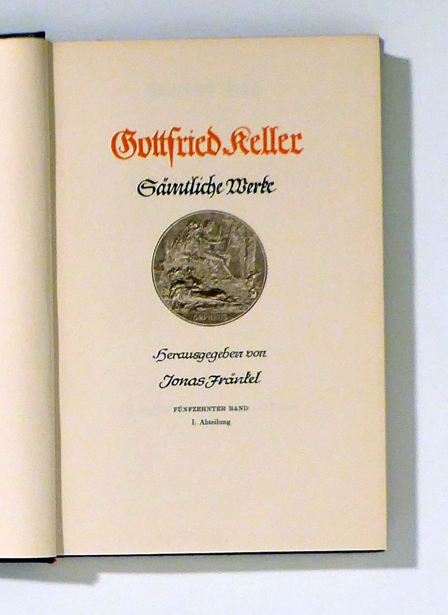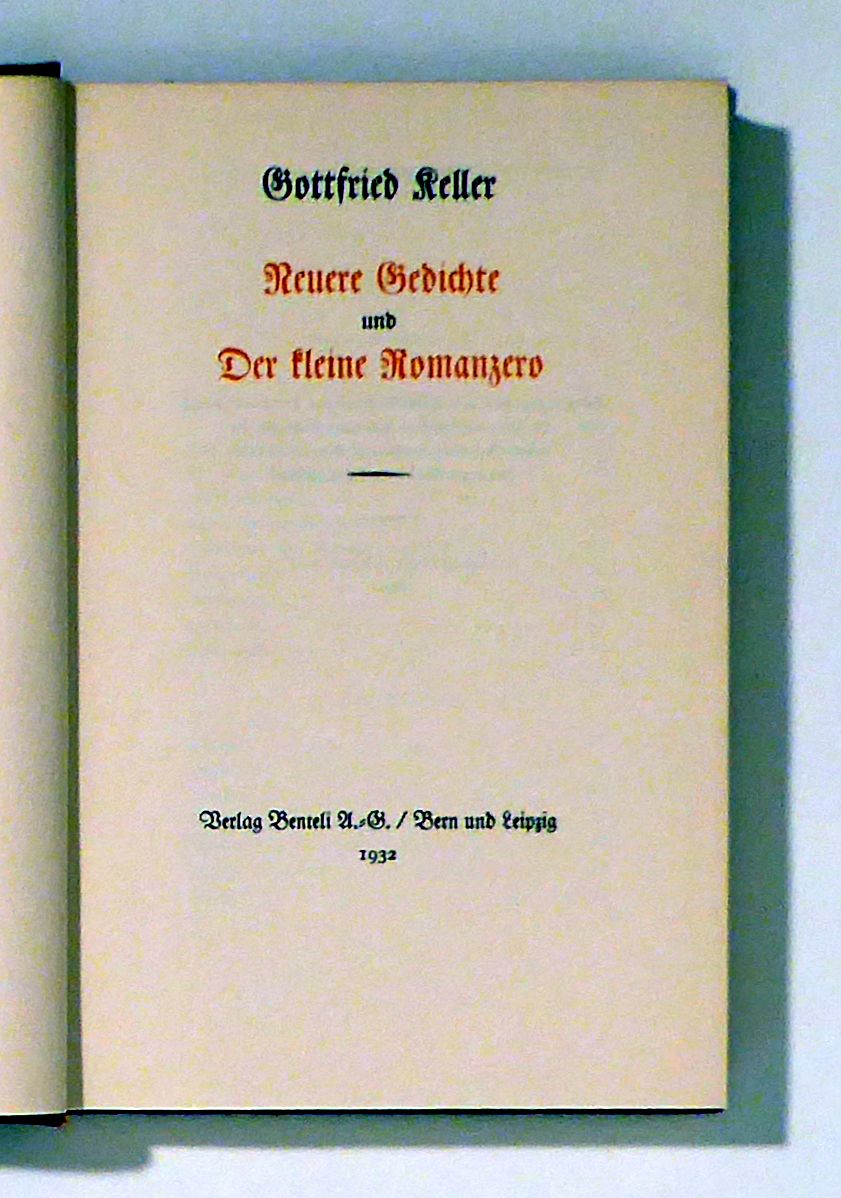 Bern; Lpz.: Benteli, 1932. 312, [1] S., mit einer Titelvignette nach der Keller-Medaille von Arnold Böcklin in Holzschnitt sowie einer gefalteten Tafel mit einer Seite aus der Handschrift des "Kleinen Romanzero". Einband: Blauer Or.Ln. mit Rückenvergoldung. Format: 8°. Reihe: Sämtliche Werke, auf Grund des Nachlasses herausgegeben von Jonas Fränkel. Fünfzehnter Band, 1. Abteilung.