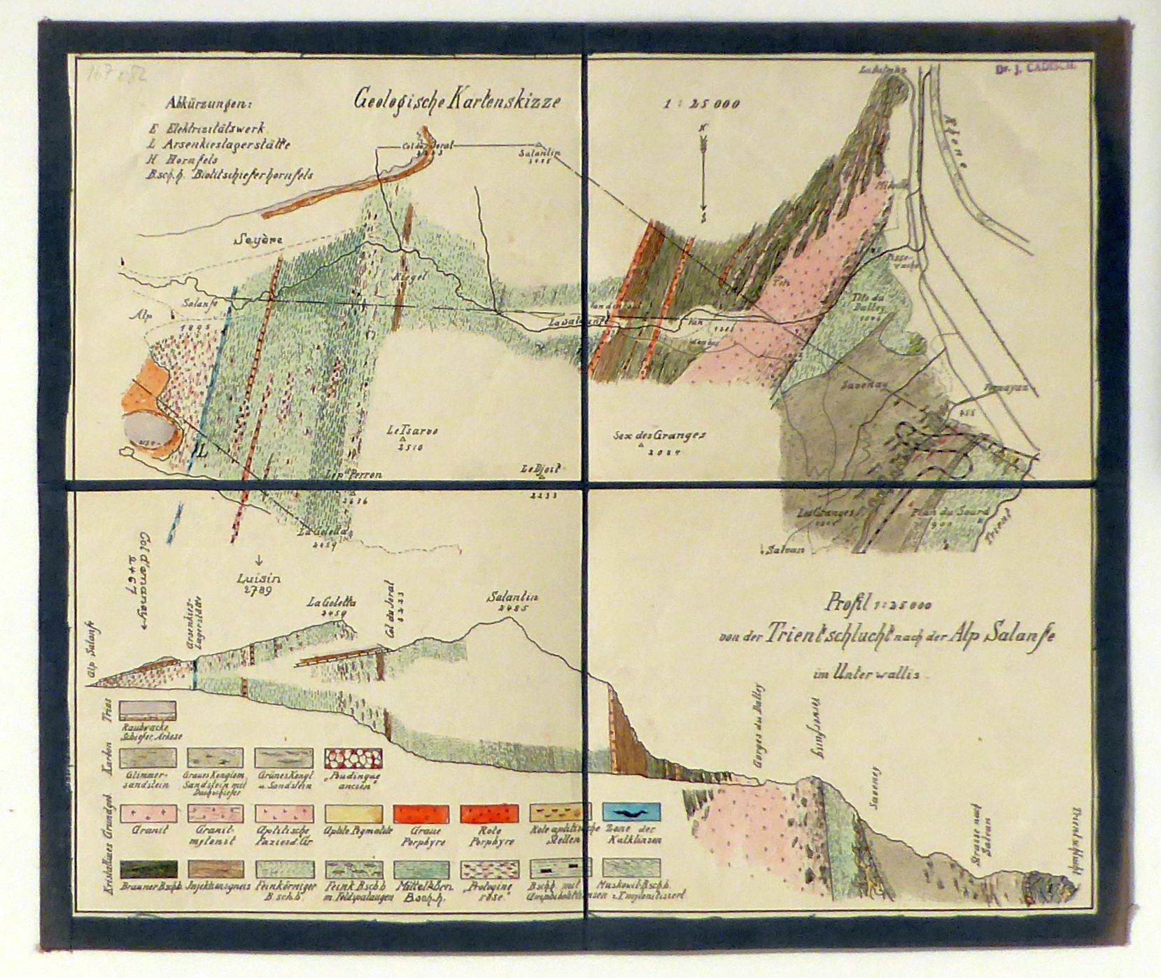 Profil 1:25000 von der Trientschlucht nach der Alp Salanfe im Unterwallis. o.O.: o.V., Einblatt, vierteilig, auf Leinwand aufgezogen, Format: 29x25 cm (bxh). Sehr schönes handkoloriertes Blatt. Vermutlich aus "Geologisch-petrograpische Untersuchungen am Massiv der Aiguilles-Rouges: ein Profil von der Trient-Schlucht nach der Alp Salanfe", einer 1914 an der Universität Bern eingereichten Dissertation