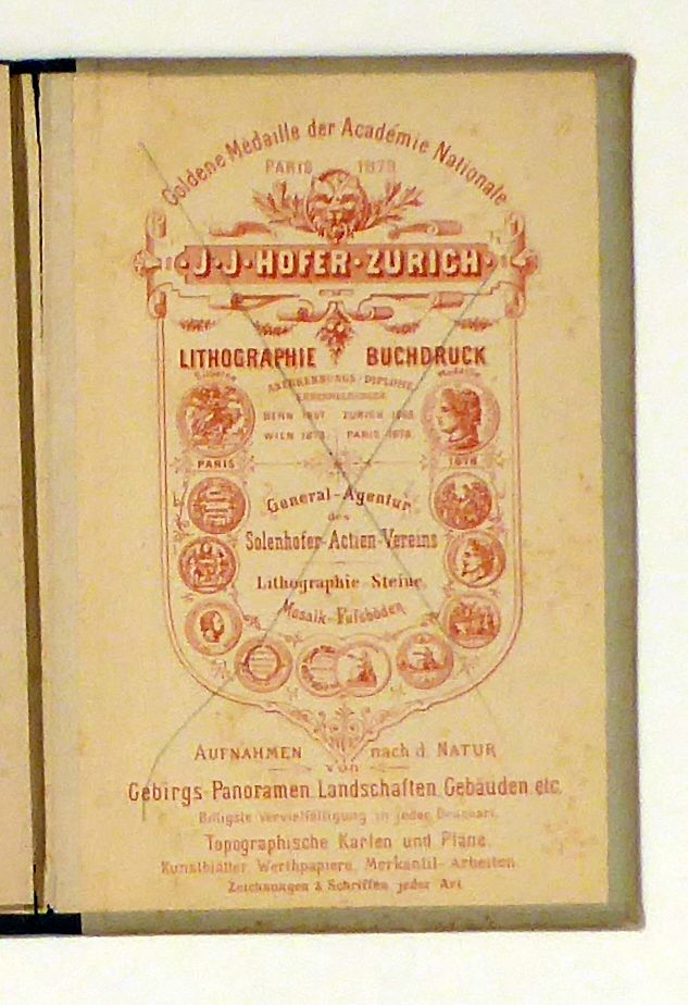 Vom Weissenstein aufgenommen - Höhenangaben in franz. Fuss über dem Meeresspiegel Lith[ographie] von X[aver] Amiet in Solothurn. o.O.: o.V., um 1880. 1 Blatt, aus 4 Teilen montiert, Einband: Kartoniert. Format: 143 x 11,5 cm (bxh), 13fach gefaltet. Erstausgabe. Nach Süden ausgerichtetes mehrfarbiges Panorama von der Rotfluh im Osten bis zur Stahelfluh im Westen. Die Gewässer sind blau coloriert. Am oberen Rand sowie im Sichtfeld mit ausführlicher geographischer Beschriftung. Breitrandiges, nicht beschnittenes Exemplar mit den Montagemarken. Montiert in eine überzogene unbeschriftete Klappenmappe aus Karton mit Leinwandrücken. Graf BSL sieht darin eine Kopie des Keller'schen Panoramas von 1817. Auf der Innenseite der Kartonmappe ist ein Werbeblatt der Zürcher Lithographieanstalt von J. J. Hofer montiert. Unter diesem Namen firmierte Hofer & Burger von 1828 bis 1892. Ob daraus, und weil das Exemplar aus dem Archiv der Firma stammt, geschlossen werden kann, dass das Panorama auch hier hergestellt wurde, bleibt Vermutung. In der Bibliographie von Hauri ist es nicht verzeichnet. Unbelegt ist auch das vermutete Herstellungsjahr. Der französische, respektive Pariser Fuss wurde in der Westschweiz und Teilen des Kantons Bern bis zur Einführung des metrischen Systems im Jahr 1877 verwendet. Von diesem Panorama gibt es auch einfarbige Exemplare,