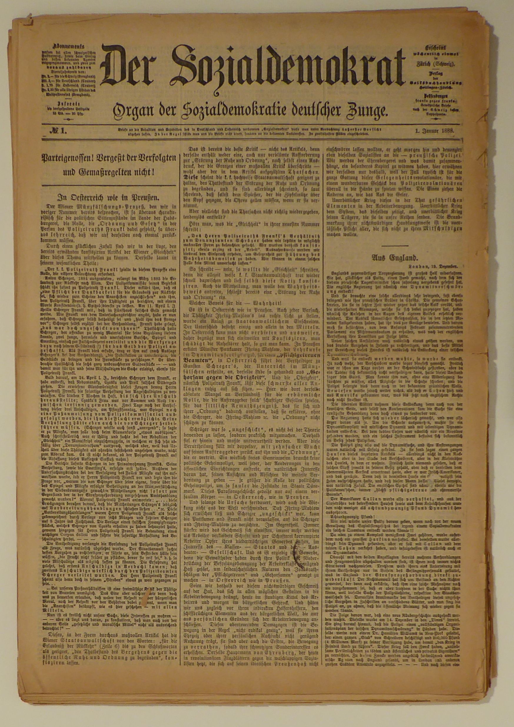 Organ der Sozialdemokratie deutscher Zunge. Hottingen-Zürich: Volksbuchhandlung, 1888. 26 Nummern, je 4 S., Einband: lose Bogen. Format: 2°. Reihe: Der Sozialdemokrat, N° 1-26, Jahr 1888.