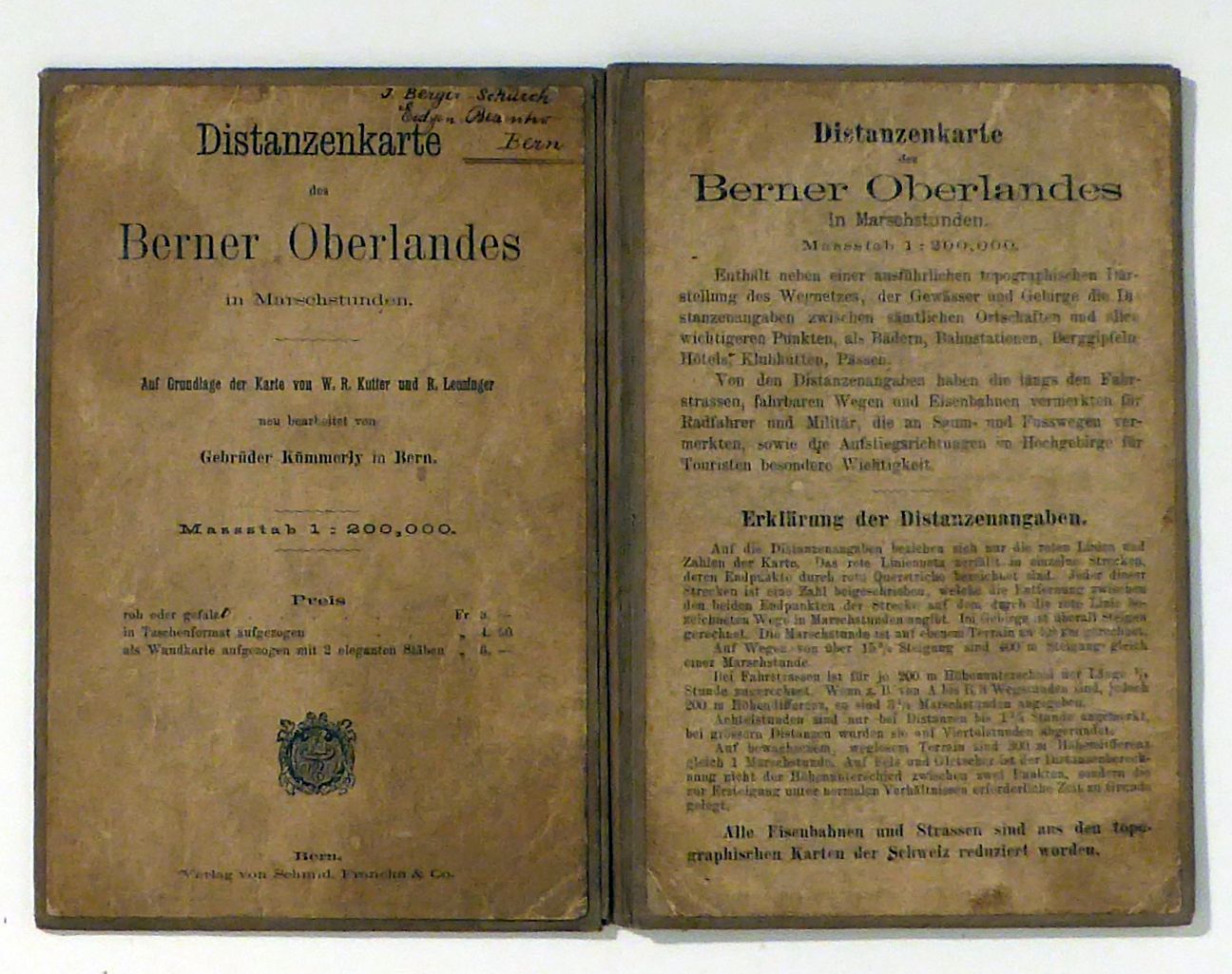 Auf Grundlage der Karte von W[ilhelm]. R[udolf] Kutter und R[udolf] Leuzinger neu bearbeitet von Gebrüder Kümmerly in Bern. Massstab 1:200,000. Bern: Schmid, Francke, [1896]. 1 Blt., mehrfach gefaltet, Einband: Leinwand. Format: 73 x 55 cm (bxh); gefaltet 12 x 18 cm. Erstausgabe. Mehrfarbige Schraffenkarte des Berner Oberlandes, eingetragen in roter Schrift entlang der Strassen, Wege und Routen die Marschstunden. Von Kirchberg im Norden bis Sion im Süden und Moudon im Westen bis Realp im Osten.Aufgezogen und eingefasst auf Leinwand. Mit einem Titelblatt und einem Blatt mit Beschreibung und Anleitung zum Gebrauch. Von dieser Karte gibt es auch Ausgabe ohne Eintrag der Marschzeiten. Eisenbahn und Strassen wurden auf Grund der topographischen Karte der Schweiz eingetragen. Selten