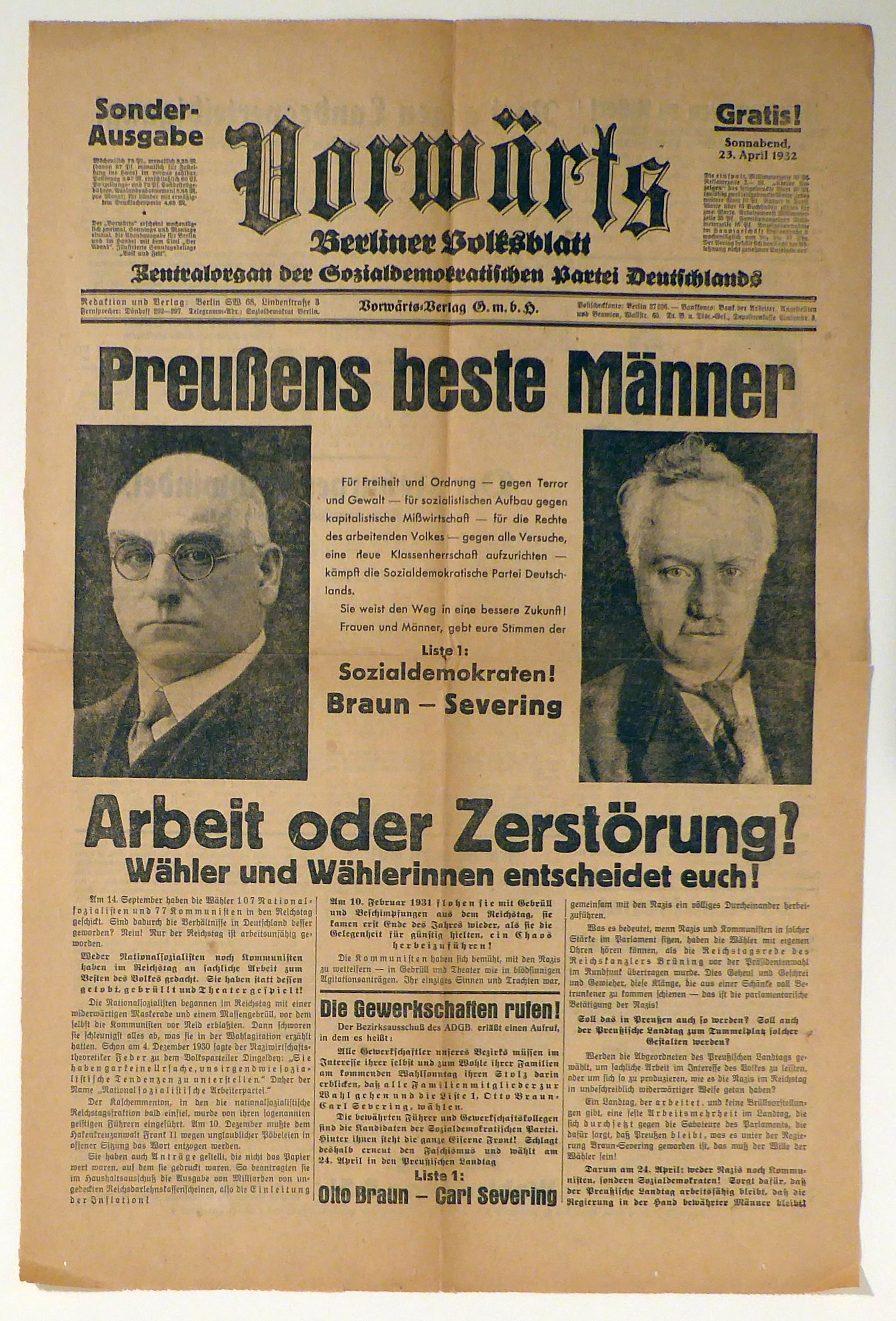 Doppelseitig bedruckte Ausgabe des "Vorwärts". Mit dem Titel "Preussens beste Männer. Arbeit oder Zerstörung? Wähler und Wählerinnen entscheidet euch!" Mit Porträts von Otto Braun und Carl Severing. Anlass war die für den 24 April 1932 angesetzte Wahl in den Preußischen Landtag., gedruckt in Fraktur